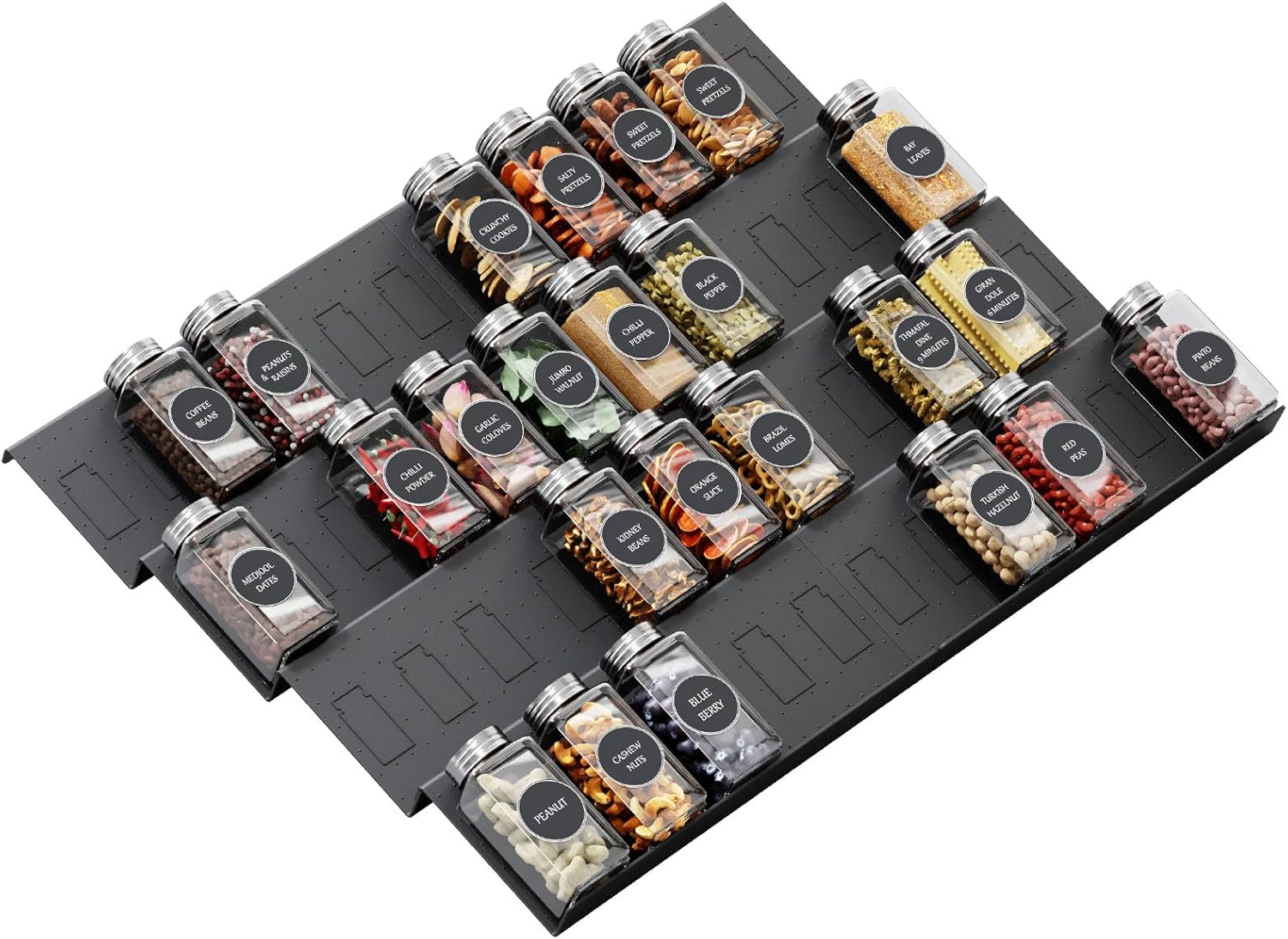 - Expandable and Overlapping: Seasoning drawer organizer can extend from 11.7" to 23.2". Adjustable spice rack organizer for drawer compatible with most kitchen drawers . Please measure your drawer before purchasing to ensure this spice organization for drawer suits your needs.