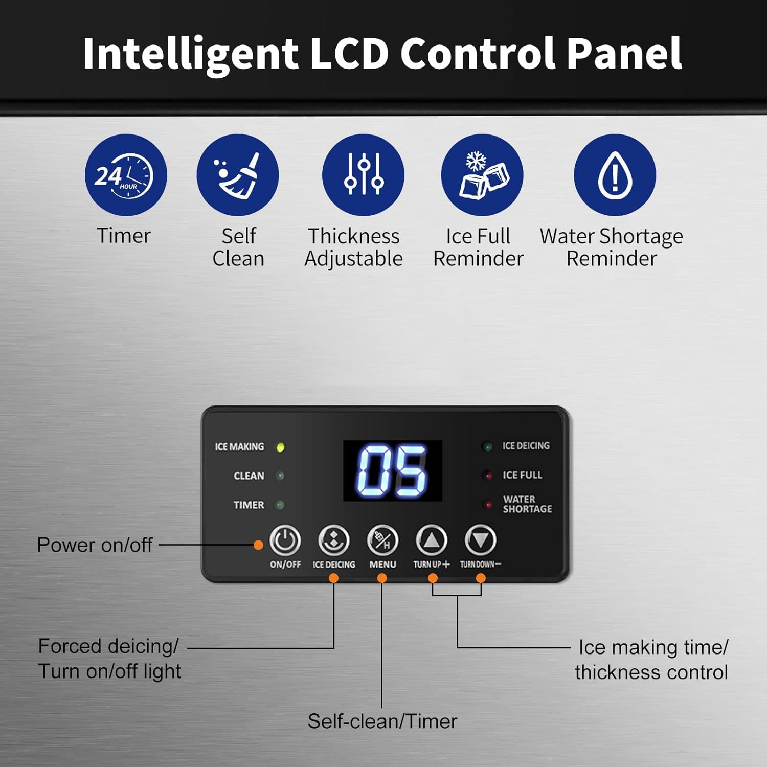 - [Advanced LED Smart Panel] Our ice maker machine commercial is equipped with super advanced LCD panel, which can solve any function and any operation problem. You can adjust the size of ice cubes by adjusting the ice making time. Besides, our commercial ice maker has timer to set up delayed time for power on/off. Easy operation with detailed indicators allows you to enjoy your ice time intelligently.