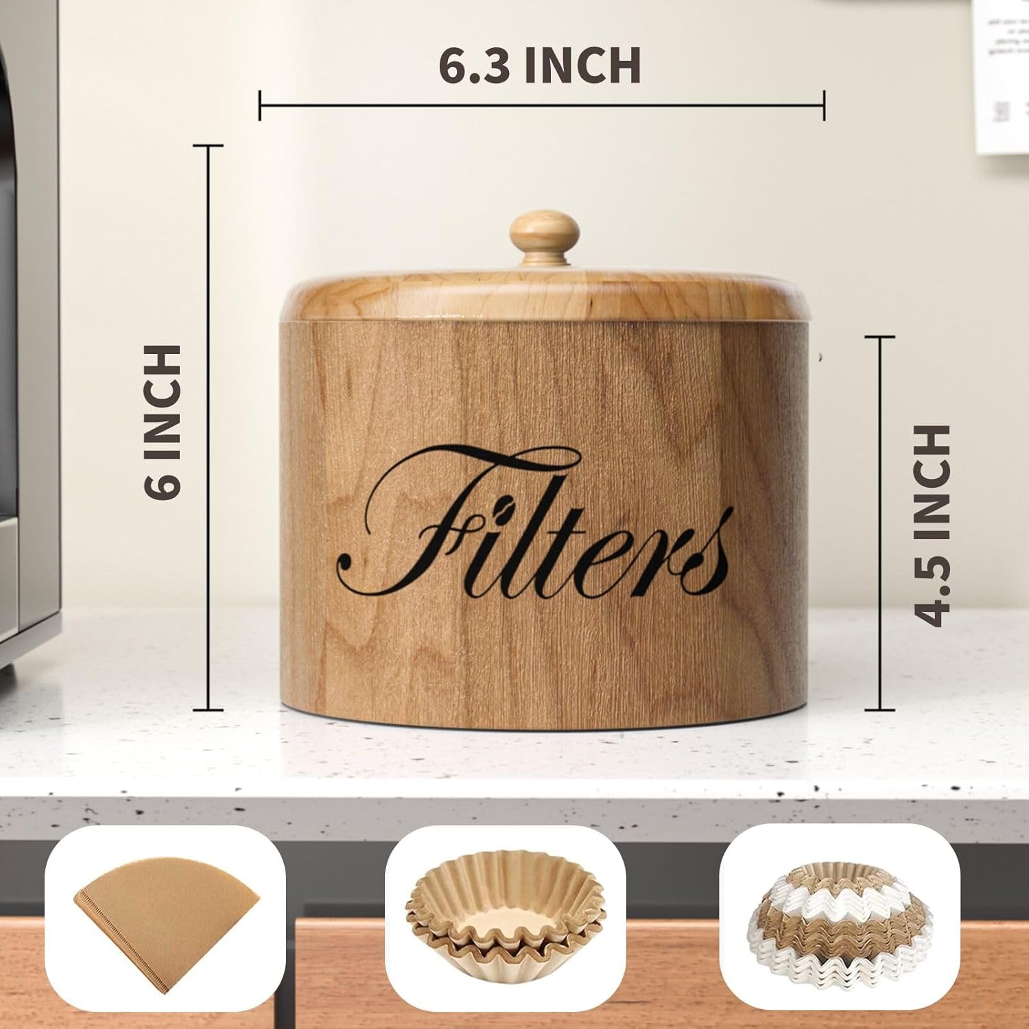 - 【Keeps Filter From Losing Shape】: This round coffee filter holder measures 6.3" in diameter x 6" high, large can keep your coffee filters from losing shape and adds class to your home or coffee bar. Add style and functionality with this rustic farmhouse coffee bar organizer.