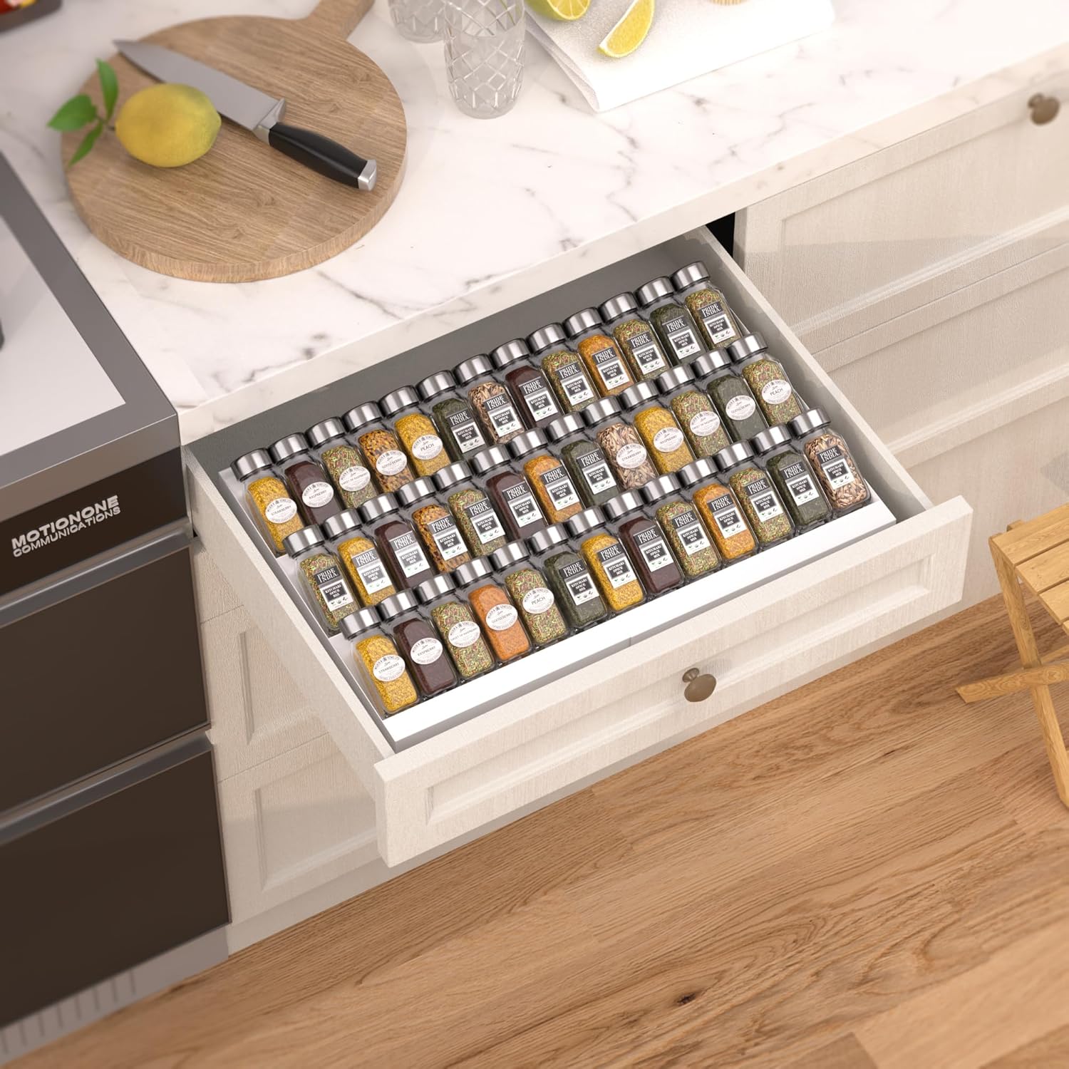 - ⭐【Expandable Spice Drawer Insert】Expandable width:12.8"W~23.6"W,suitable for most drawers,just need place the inserts in your drawer and adjust it to the desired size.With using the slanted levels spice drawer, the bottles will become clear at a glance, which is convenient for you to quickly select what you need.