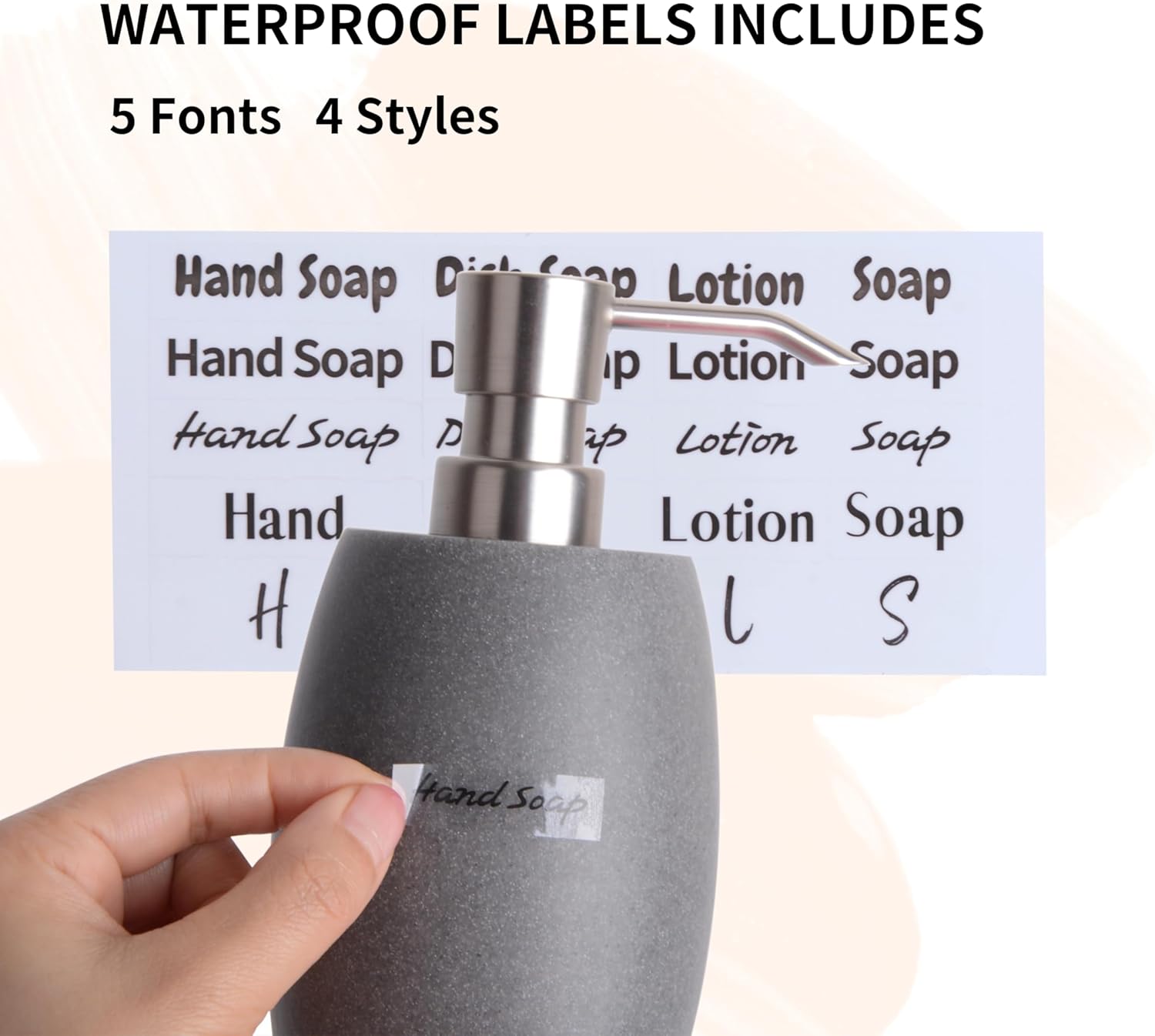 Sandstone Textured Resin Soap Dispenser with Metallic Pump and Waterproof Bottle Labels for Bathroom Kitchen Dish Hand Wash Shower Lotion Shampoo, 12 Oz, Gray