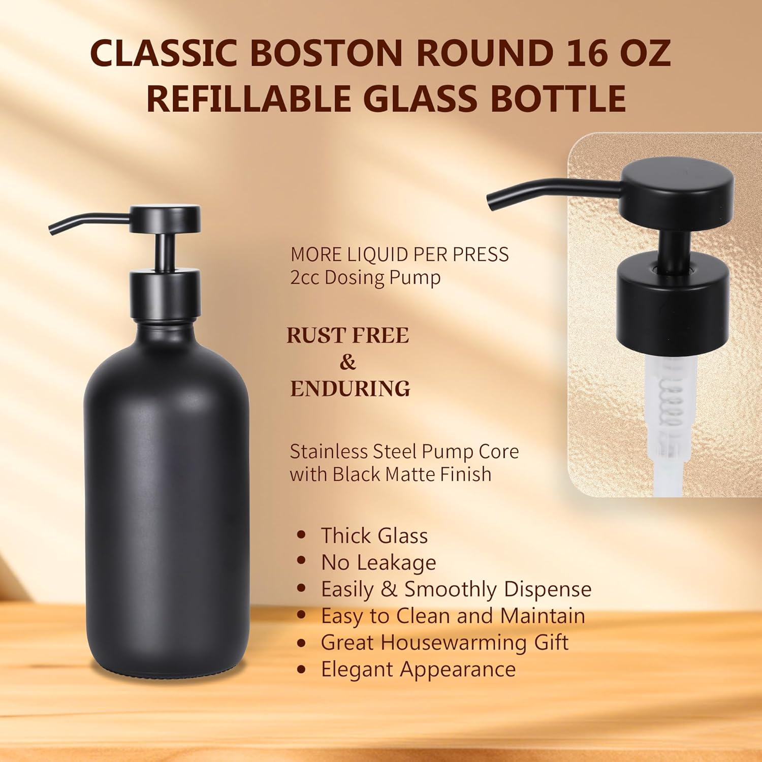 - SUPERB CRAFTMANSHIP: The heavy duty nozzle of dish soap dispenser can pump an adequate amount for each pump to not be wasteful, yet enough to lather and clean. The glass design is both elegant and enduring, and the glass soap dispenser holds a lot of liquid, so you will not have to refill too often.