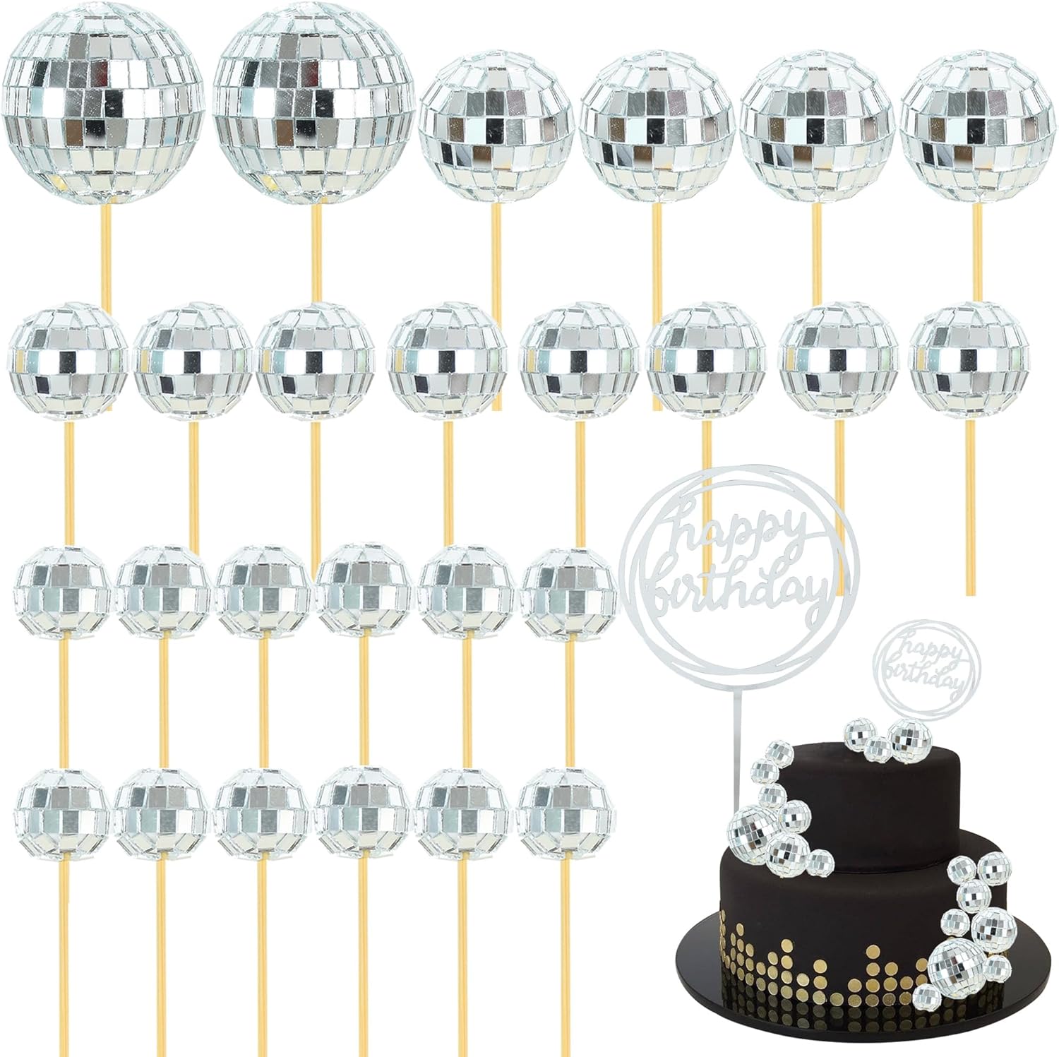 - 【Package】You will get 26 x silver disco balls cake toppers in different size, and 1 x happy birthday cake topper, very exquisite and super valuable.