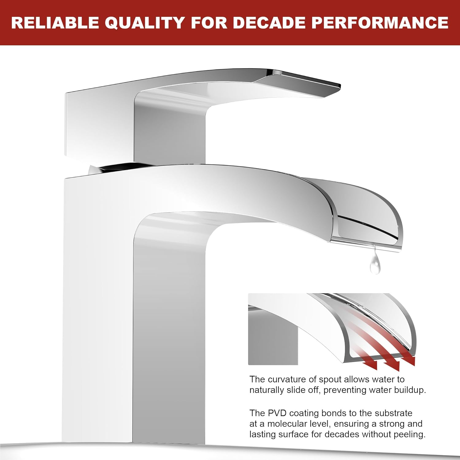 Polished Chrome Bathroom Faucet 1 Hole Waterfall, Vanity Faucet for Sink Single Handle Modern Mixer Tap with Pop-up Drain Stopper for Lavatory Farmhouse RV