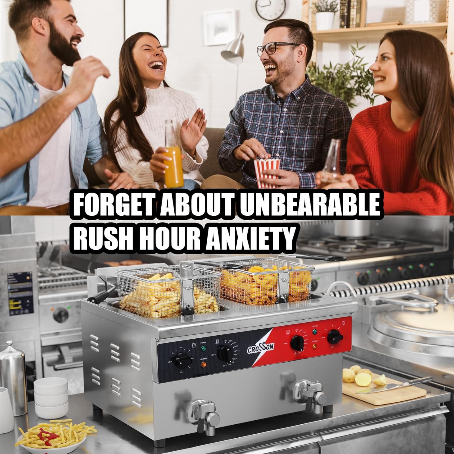 CROSSON 16L Dual Tank Countertop Electric Deep Fryer with "Swing-up and Hold",Drain Valve,Strech forming Oil Tank and Solid Wire Mesh Basket for Restaurant Use 120V,3600W Commercial Deep Fryer