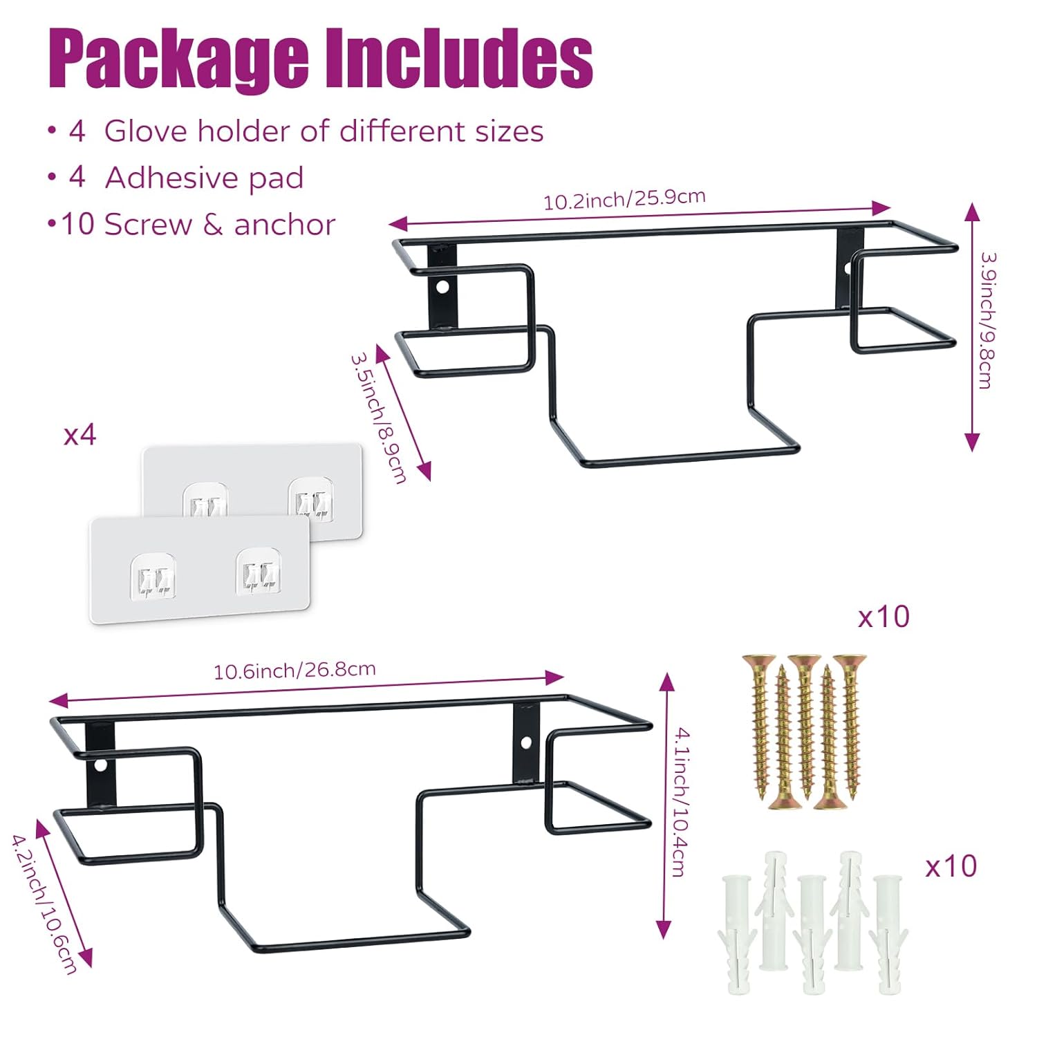 - What Will You Receive:4 glove holders, one large and one small in size. 4 adhesive pads, 10 screws and anchors. The large one can hold boxes measuring 10.28"L*3.78"W or smaller, and the small one can hold 9.8"L*3.1"W or smaller.
