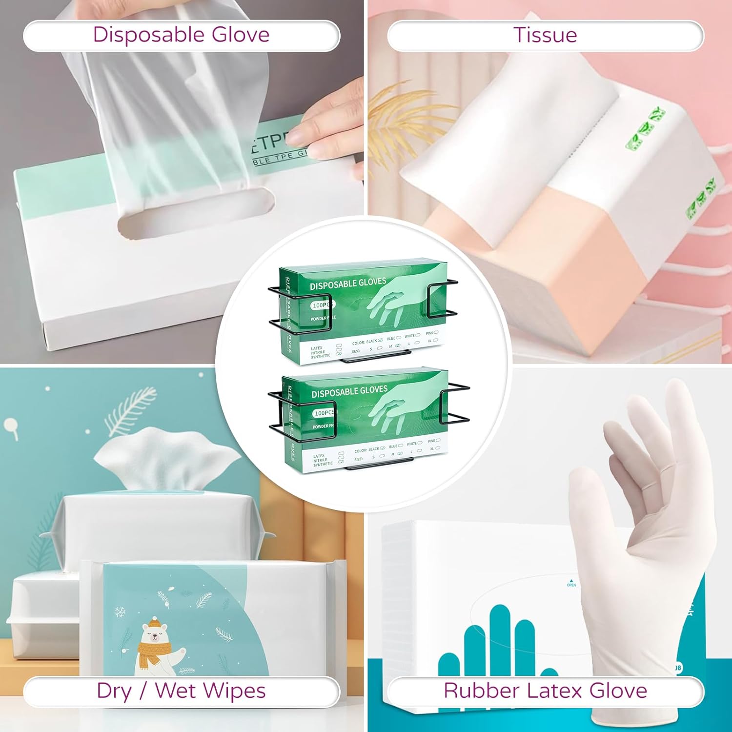 - Not Just Designed for Gloves: The holder can also be used to hold tissues, dry / wet wipes, plastic ziplock bags, trash bag and more. Suitable for kitchen, garage, lab, hospital, food service, salon, etc.