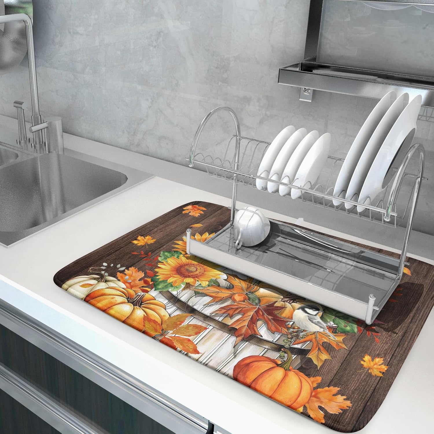 - 【Protect Tableware】Place your dishes on it or under dish racks, the autumn pumpkin dish mat prevents bowls, glassware, and more tablewares from being scratched or worn, can be used as dish drying mat, sink mat, dishes drainer mats to keep the countertop dry and tidy.