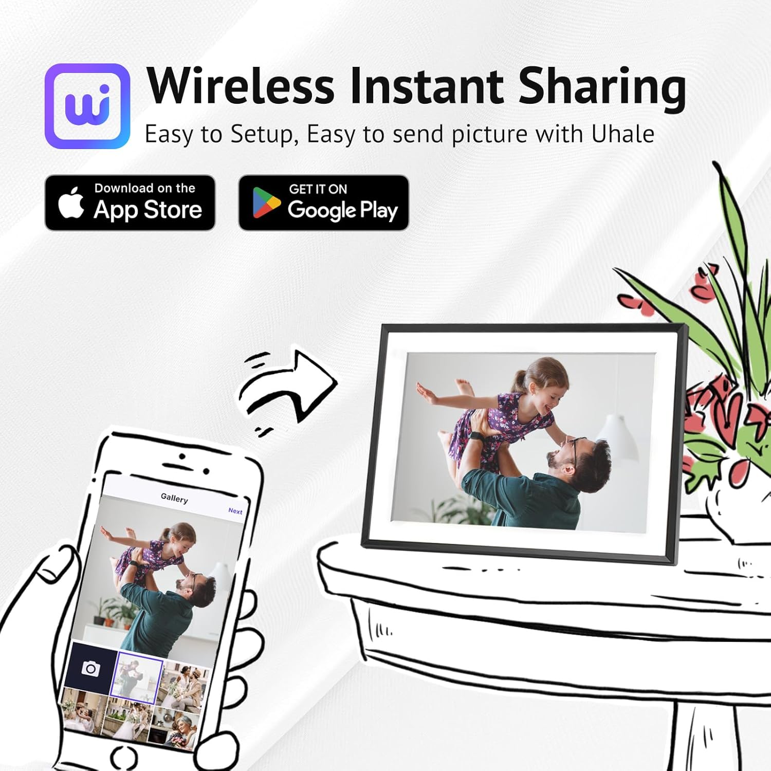 - ๐๐ก๐๐ซ๐ ๐๐จ๐ฎ๐ซ ๐๐จ๐ฆ๐๐ง๐ญ ๐๐ง๐ฌ๐ญ๐๐ง๐ญ๐ฅ๐ฒ: Connect Euphro digital picture frame to a WiFi network and share photos and videos via the free โUhaleโ app, available on both Android and iOS. Share the special life moments instantly and privately, creating a seamless connection with your family and friends.