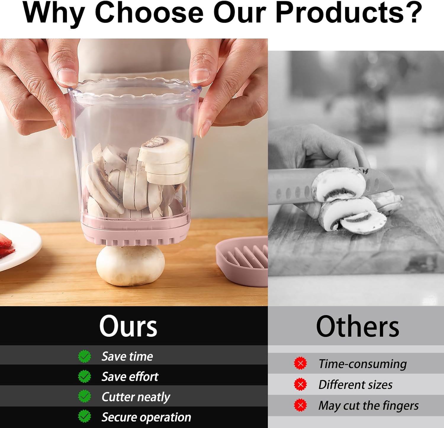 - Fruits Slicer: Fruit Slicers 8 times faster than a knife! Our fruit cutter makes prep a breeze. Easily cut 18 strawberries in 9 seconds, saving you time and energy. With this fruit chopper you can easily slice fruits and vegetables into more uniform shapes, save your time and make slicing fruits a breeze.