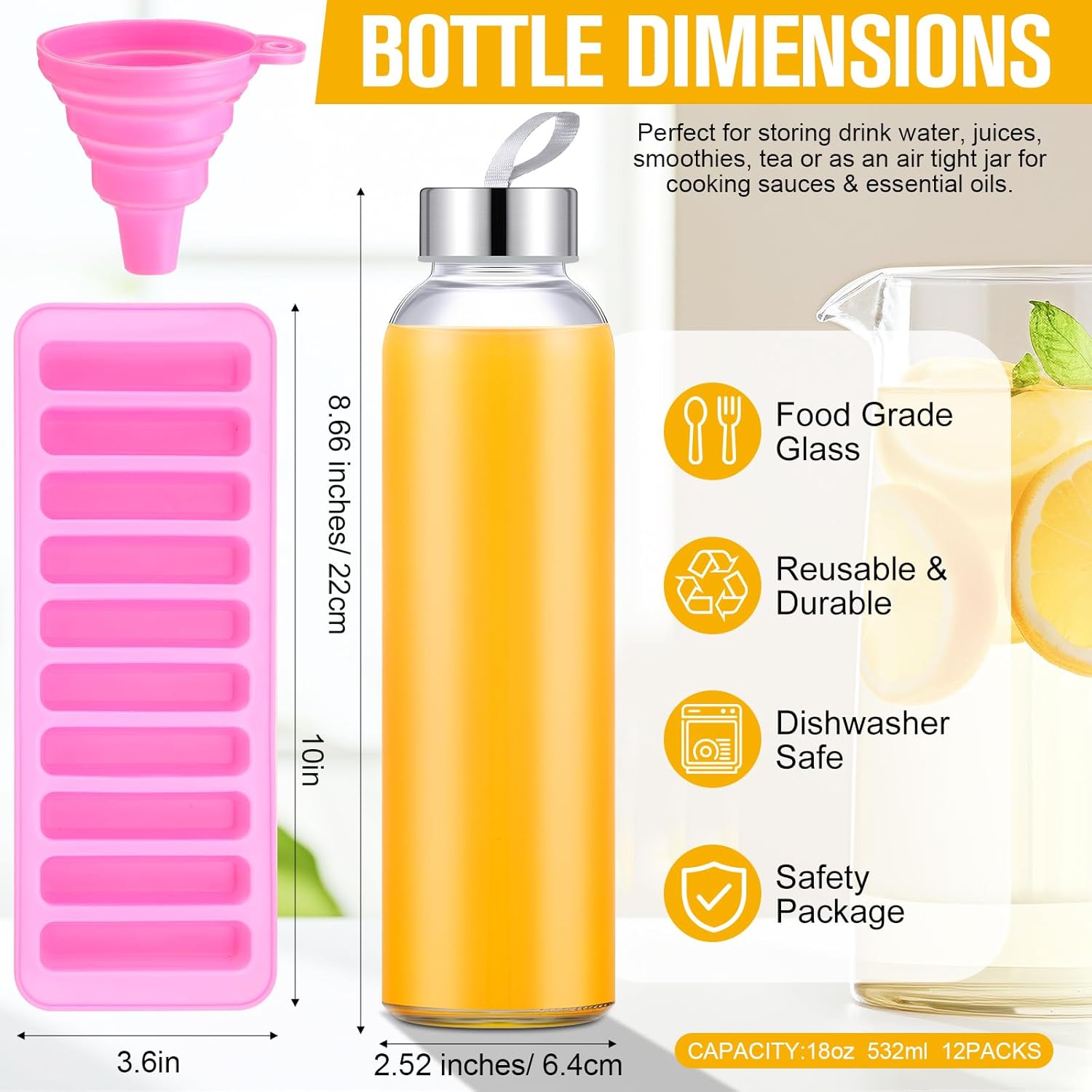 - Value Pack: juicing kit bundle includes 12 clear 18 oz glass juice bottles with airtight lids, 12 stainless steel lids, 12 bamboo lids, 12 protection sleeves in 6 colors ,a funnel helps you pour liquids inside the containers, a silicone ice mold makes ice for adding ice easily, a bottle cleaning brush for easy hand washing; Sufficient sealing lids ensure that the glass bottles applied always remain sealed; Get our juicing bottles as gift for your whole family and friends
