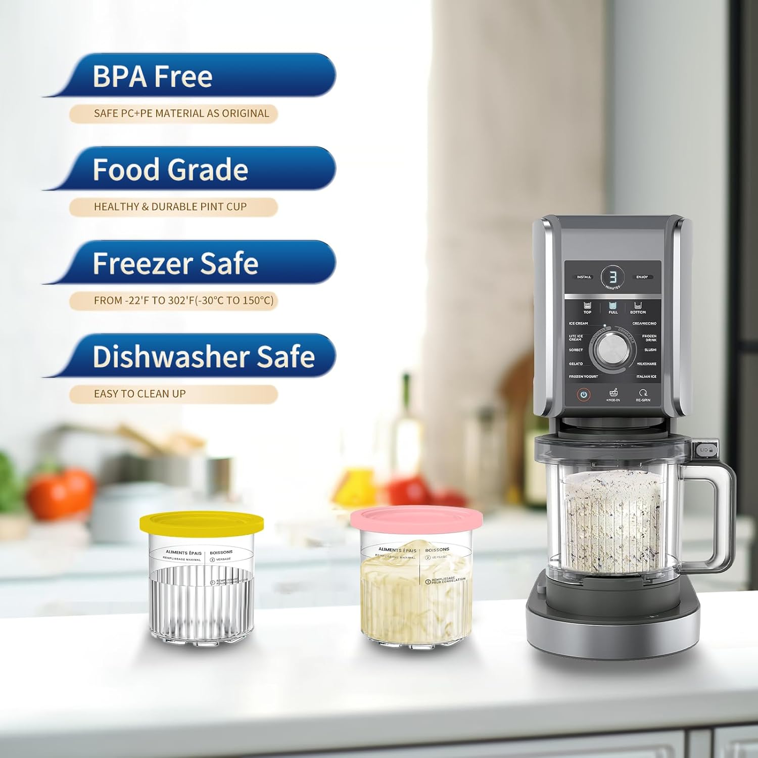 - 💖 Premium Quality: Durable and sturdy pints are made of food-grade, BPA-free materials. Upgraded sealing lids help store ice cream, yogurt, sorbet frozen food freshness and prevent spills or leaks. Easily transforms to a soft, creamy texture in just minutes.