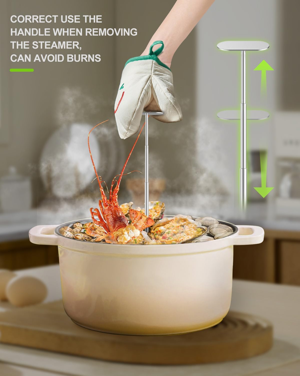 - 【Upgraded Safety & Durability】 ① T-shaped extendable handle (3.1"→6.6") safely lifts hot trays without steam burns ② Food-grade 304 stainless steel resists rust/scratch vs plastic-handled steamers ③ Silicone feet protect cookware and countertops from scratches