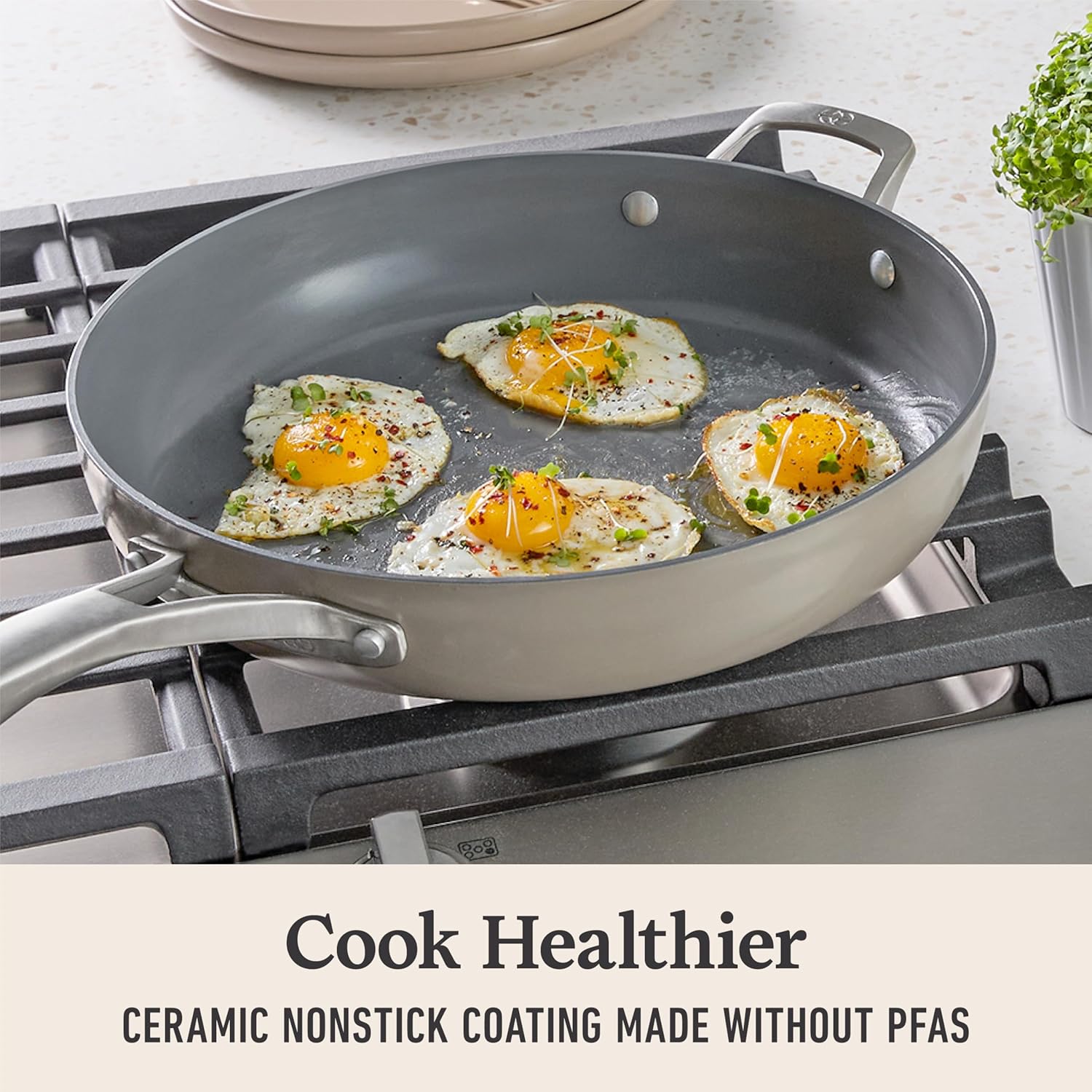 - Ceramic Nonstick Coating Made Without PFAS: Cook healthier, without the need for additional oil or butter.