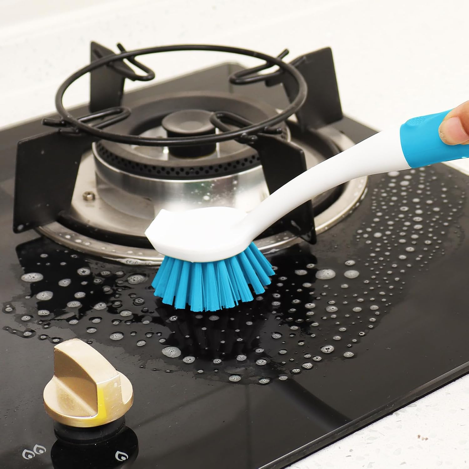 Dish Brush with Handle, 2 Pack Scrub Brushes with Built-in Scraper for Cleaning Kitchen, Pots, Pans and Sink, Scrubber Washing Tools, Blue
