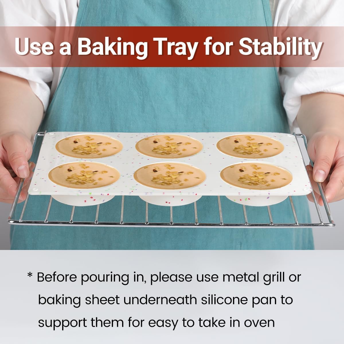 - Tips: Due to made out of silicone, it's flexible, please make sure to put silicone baking pan on a cookie sheet for support before filling in