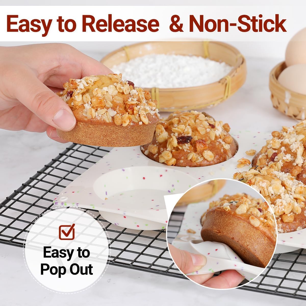- Easy to Release: Polish surface and flexible silicone makes it’s a breeze to pop out, easy to clean thoroughly. It’s more robust than traditional metal baking pan, rust resistant