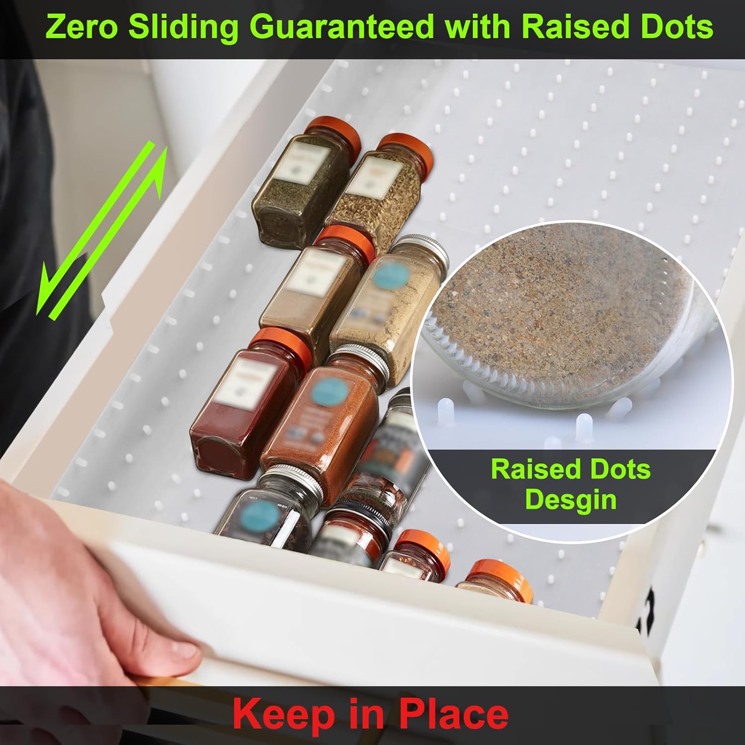 - 【Zero Sliding Guaranteed with Raised Dots】Spices Drawer Organizer made of Premium silicone material also the patented designe have raised points and grip-enhanced surface that helps keep seasoning jars in place, preventing them from sliding or shifting. so no worry spice bottles move all over in draw.