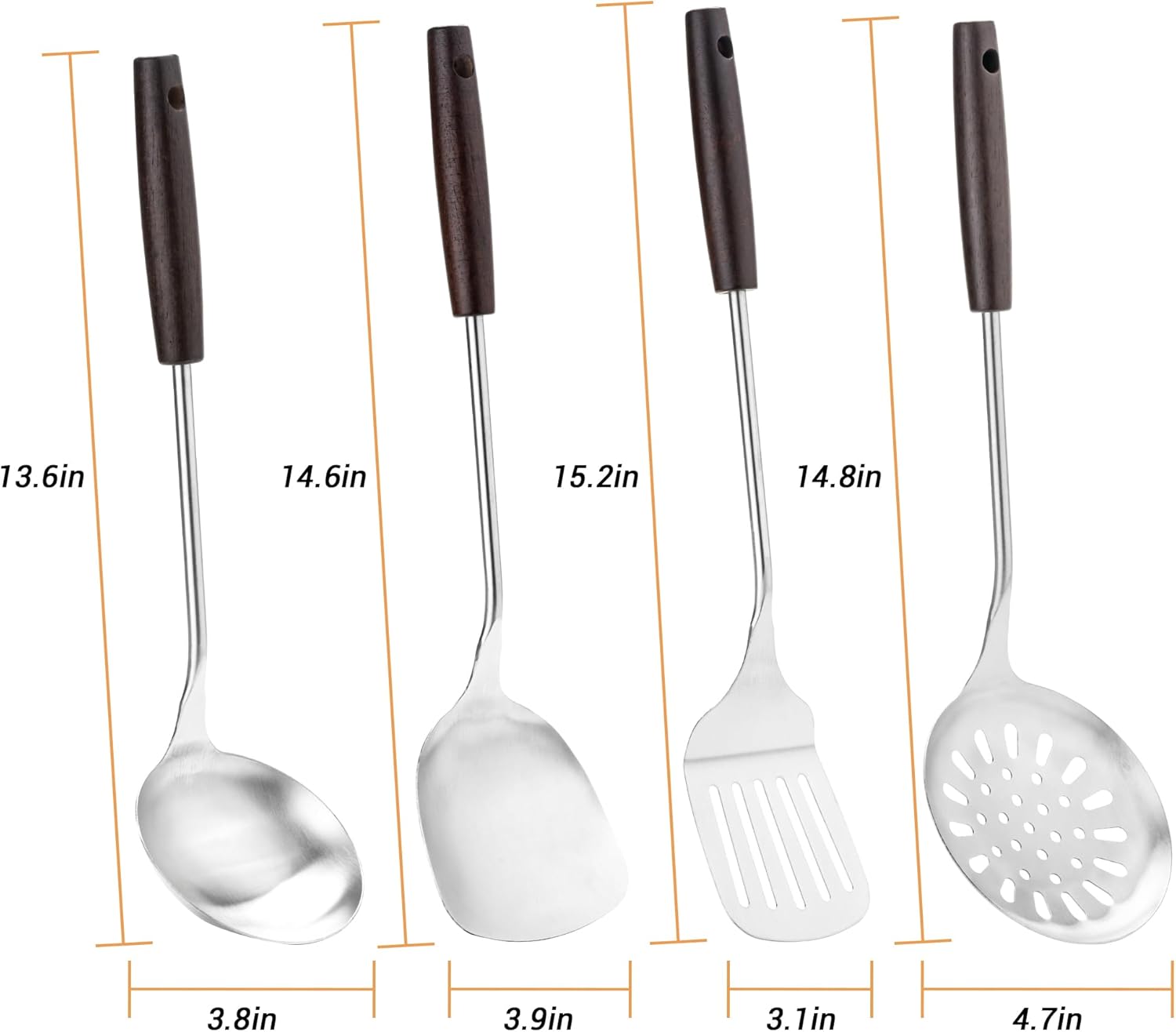 FJNATINH Cooking Utensils - Spatula, Ladle, Skimmer Spoon, Slotted Spatula - 4 Pieces Stainless Steel Wok Utensils Set for Carbon Steel