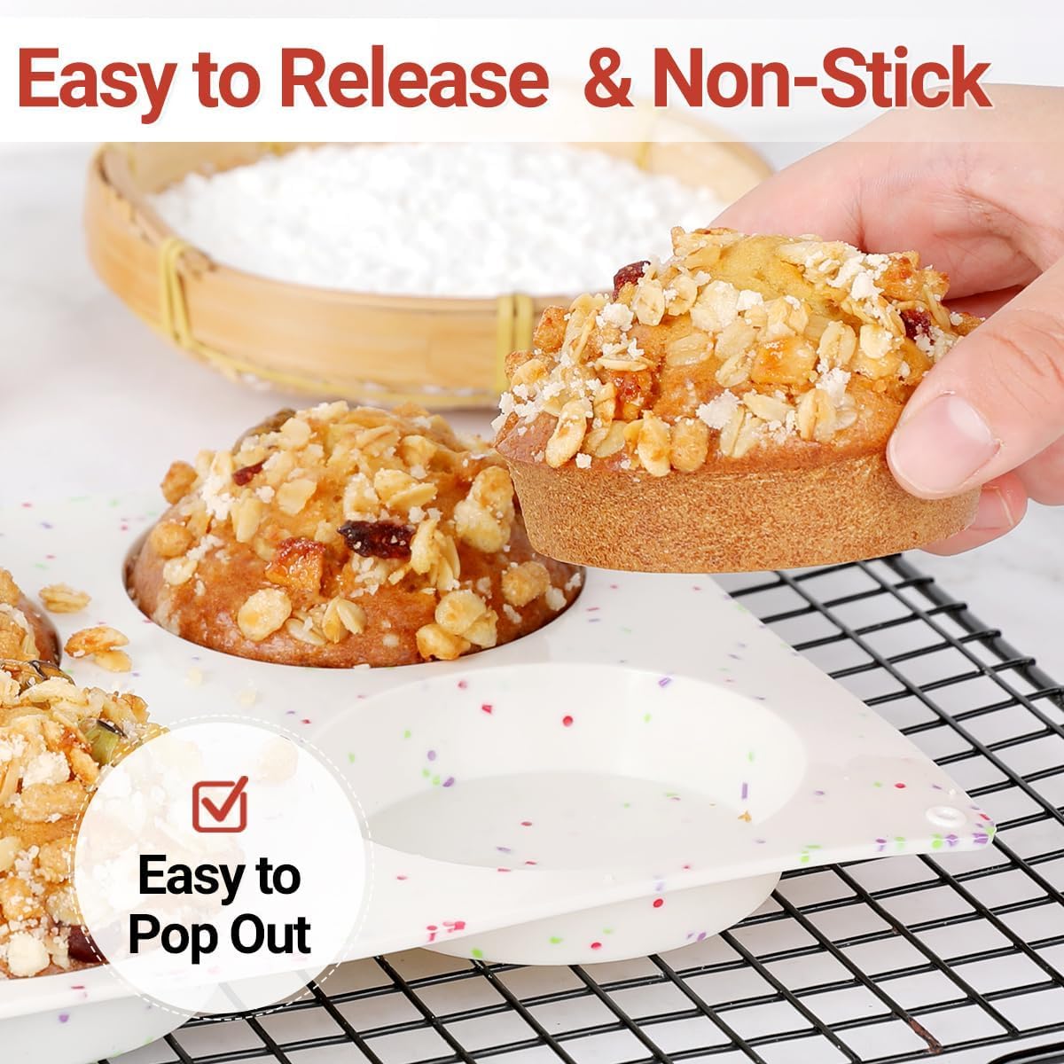 - Non Stick and Easy Release: Polish surface and flexible silicone makes it’s a breeze to pop out, easy to clean thoroughly. It’s more robust than traditional metal baking pan, rust resistant