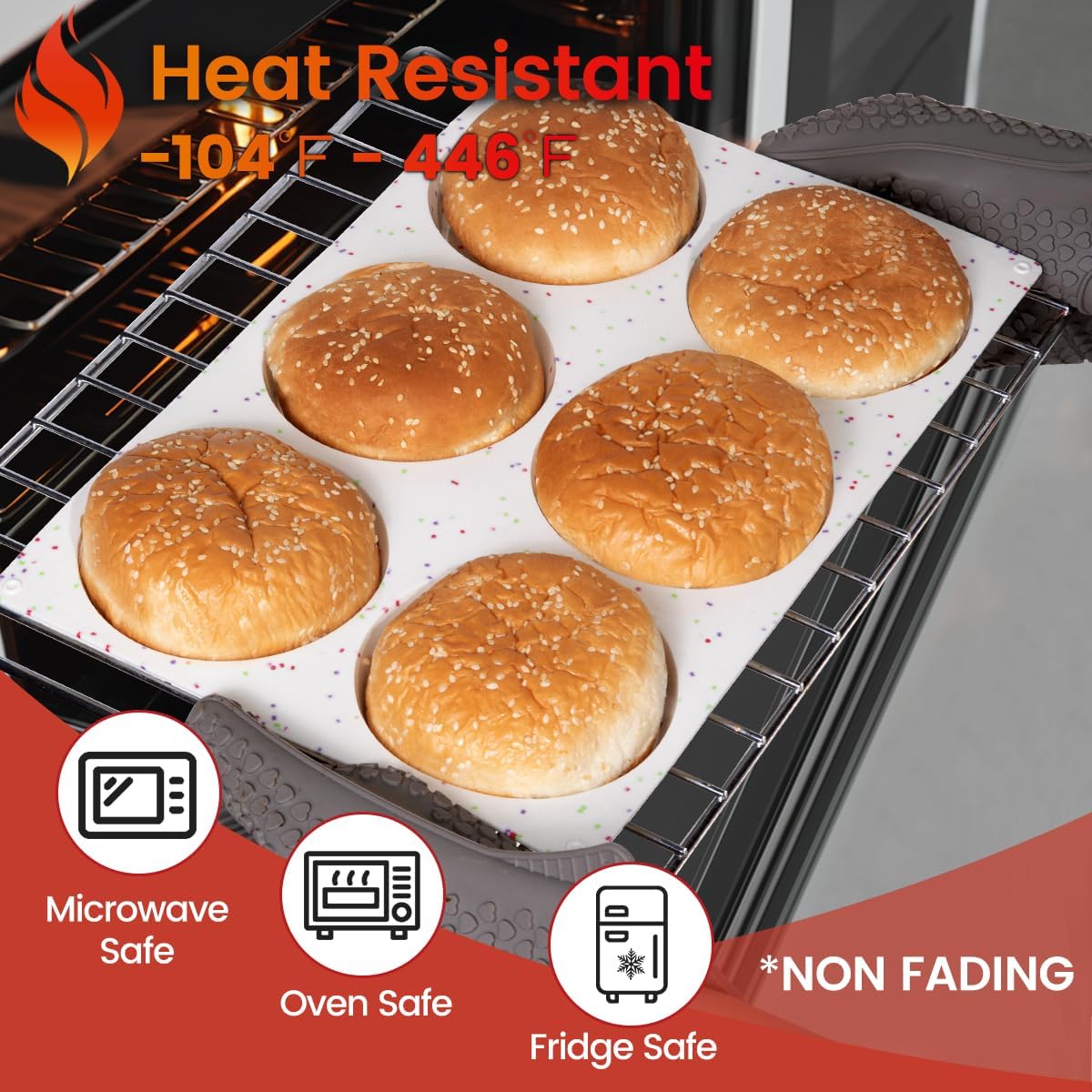 - Safet and Healthy: Safe for oven, microwave, dishwasher, fridge, freezer. Wide heat resistant range: -104 ℉ to 446 ℉(-40 ℃ to 230 ℃), these large muffin top pans are impermeable, practicality and durability