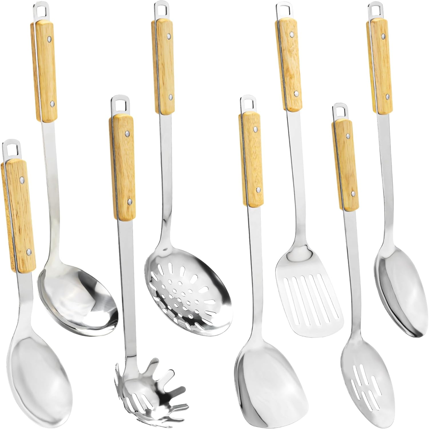 FJNATINH Cooking Utensils - Spatula and ladle Set with Wood Handle, 8 Pieces Wok Utensils Tools - Wok Accessories Cookware Set