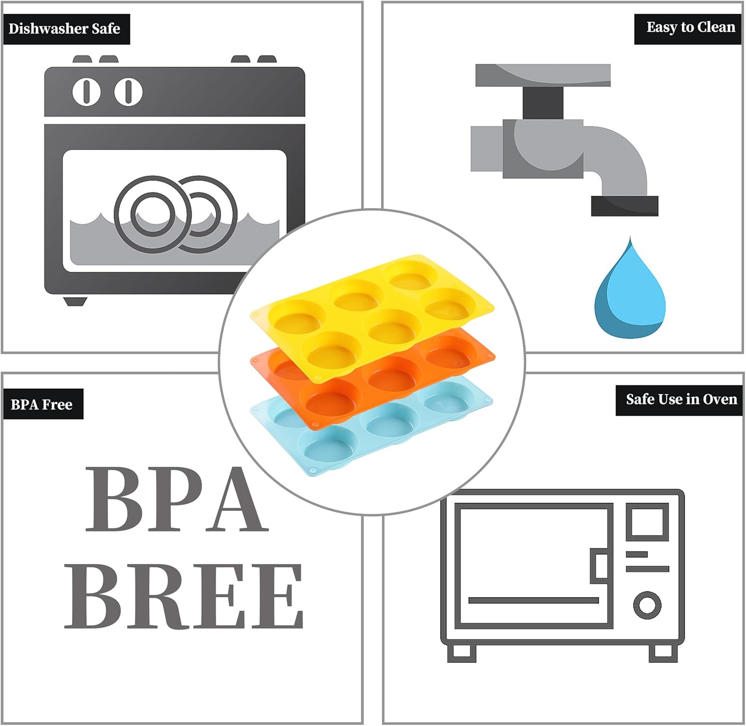 - 3. Convenient and User-Friendly: Each egg sandwich mold features 3" round compartments, perfect for creating uniformly sized portions every time. The flexible and lightweight design of this muffin top pan makes handling and storage effortless. Dishwasher safe for quick and easy cleanup, also easy to wash by hand with warm, soapy water.