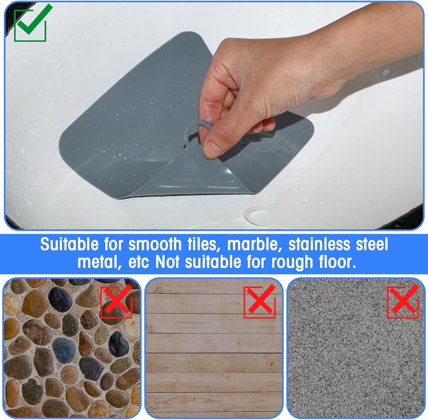 - Safe and Reliable: the drain cover is mainly made of quality silicone material, safe, reliable and strong, which can serve you for a long time; With smooth surface and neat edges, the mat can be easily adsorbed on the floor, and will not float easily