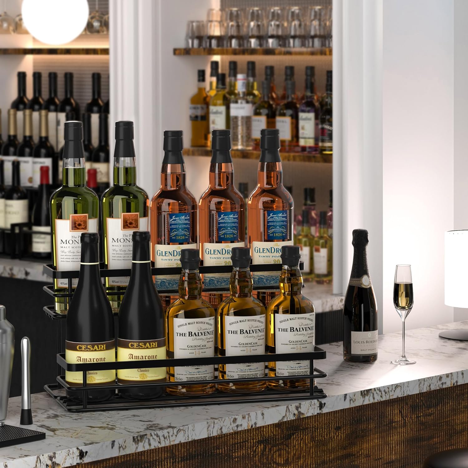 - [Multiple Uses] Used to organize flavored syrup bottles, wine bottles, wine, olive oil, vinegar and many other kitchen condiment containers and optimize your limited space. Use multiple bottle holders to suit your needs and space, which makes it perfect for kitchen bars, restaurants, wedding halls, special celebrations.