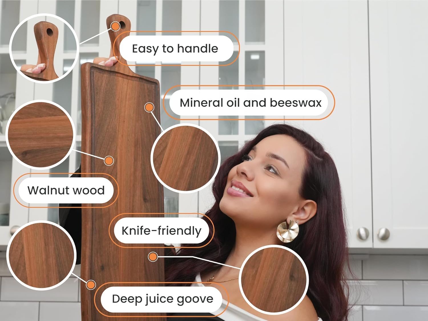 - Easy Maintenance: Keep your serving board looking its best with a simple hand wash using mild soap and warm water. Periodically treat it with food-grade mineral oil to preserve the natural luster of the walnut wood. Avoid the dishwasher to ensure the longevity of this elegant piece.