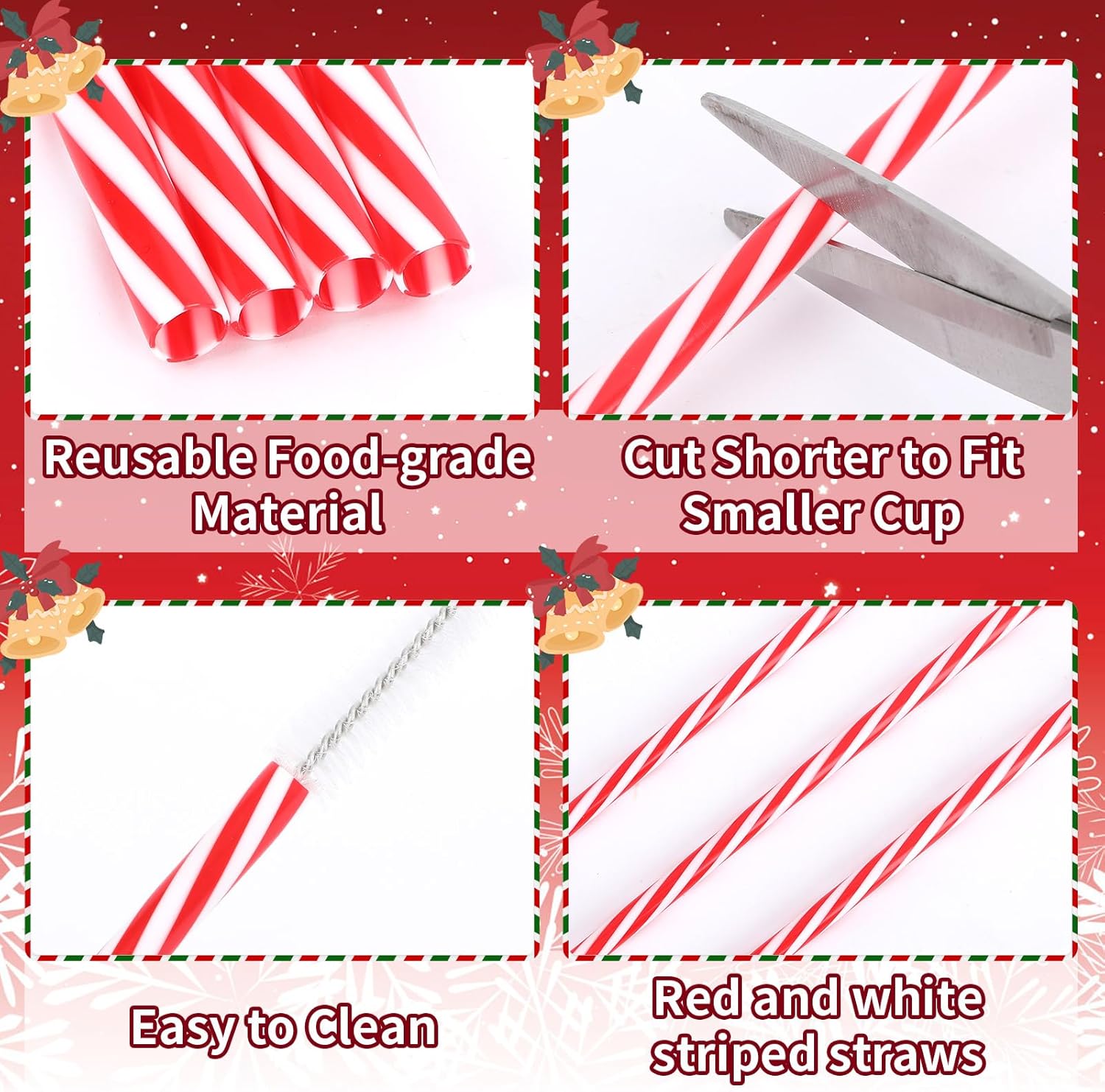 JANYUN 30 Pcs Christmas Straws Plastic, Reusable Red and White Striped Straws 9 Inch Xmas Hard Plastic Drinking Straws with Cleaning Brush for Holiday Christmas Party Favors Supplies Table Decoration