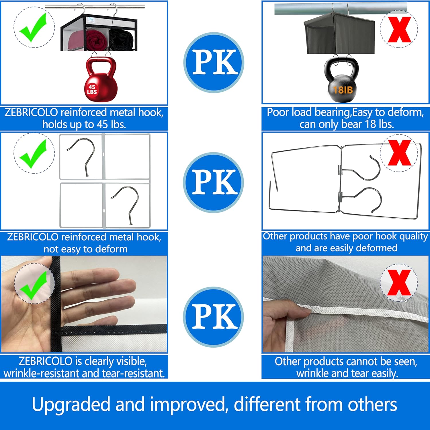 - 【Easy to Install & Sturdy and Durable】closet organizer No assembly required! The organizer comes with hooks that easily hang on any closet rod. less than five minutes to set it up.The build quality is impressive. The non-woven fabric is strong and durable, ensuring that the hanging closet organizer can hold a 45lb of weight without sagging or tearing. The reinforced seams add to its sturdiness.