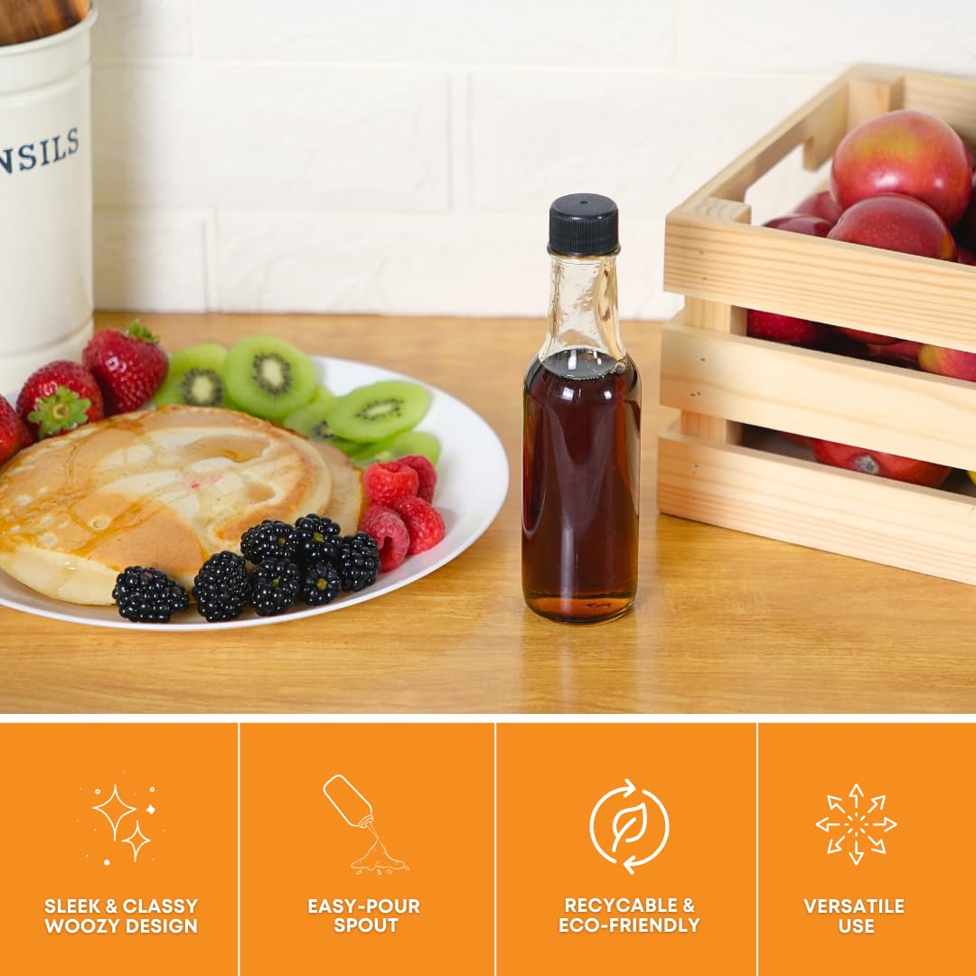 - [Durable and Stylish] Made from high quality, clear, food-grade glass, complemented by a high-grade PVC shrink capsule and leakproof plastic cap. The 5 oz glass bottles are crafted to last for years to come.
