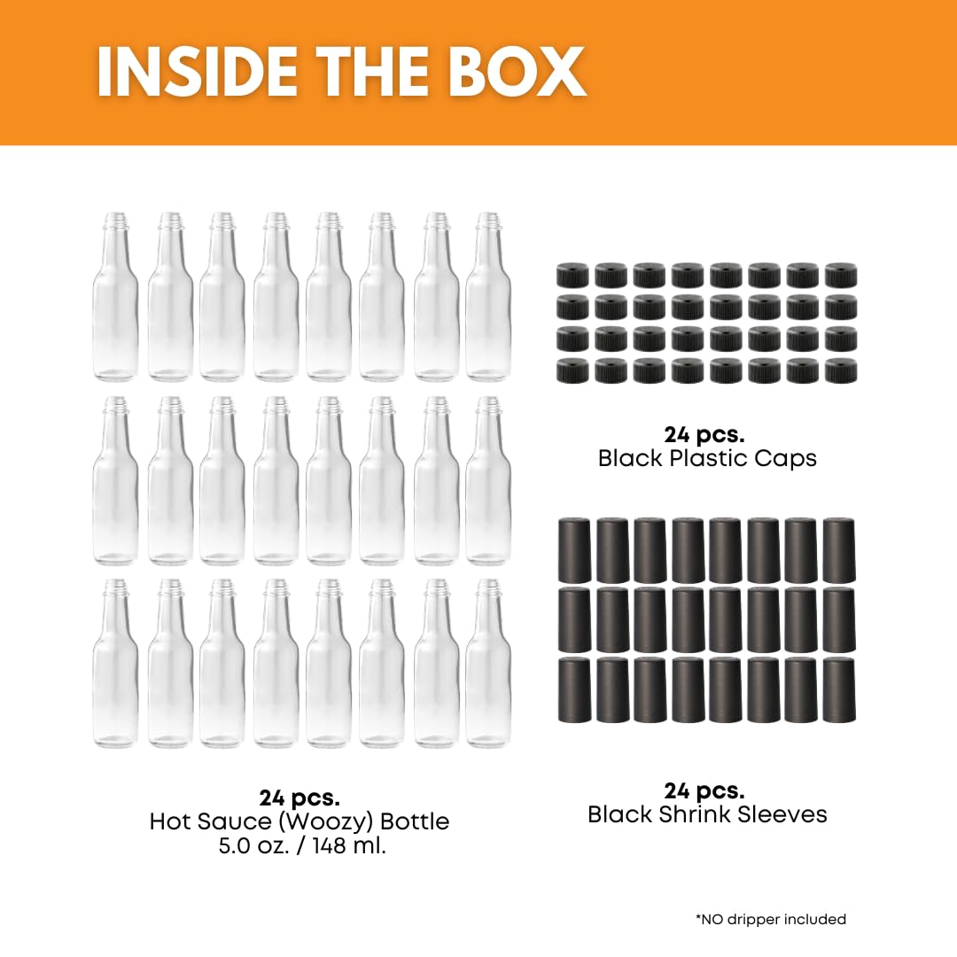 FastRack - 5oz Woozy Bottles for Hot Sauce, Pack of 24 with Black Plastic Caps & Shrink Sleeves, Empty, Clear Glass bottles with Leakproof Cap - No Dripper Included