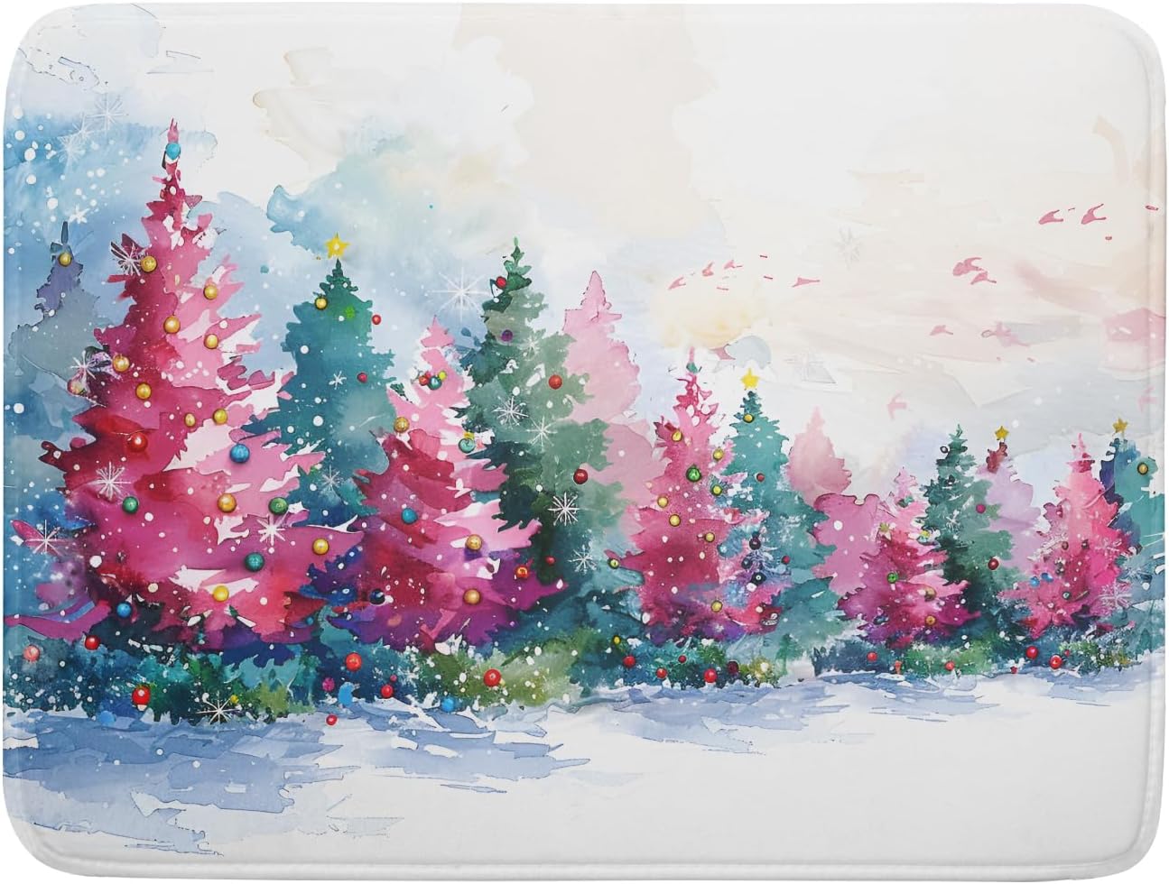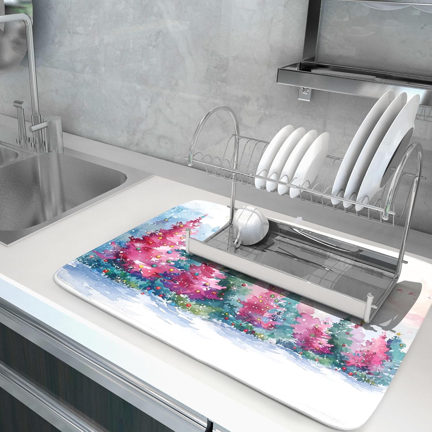 Decorative Christmas Dish Drying Mats Pink Green Xmas Tree Painting Rack Drainer Mats for Coffee Bar 18 X 24 Inch