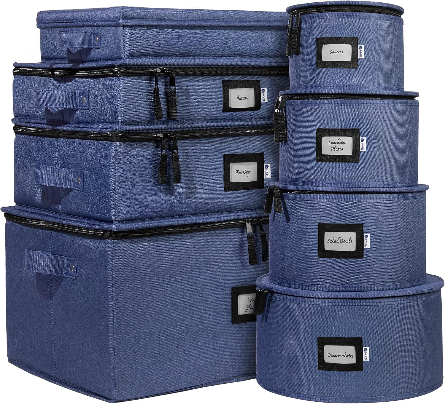 Hard Shell China Storage Containers 8-Piece Set Moving Boxes for Dinnerware, Glasses, Plates, Mugs and Saucers Sturdy Dish Organizer with Dividers for Seasonal Storage - Service for 12 - Denim Blue