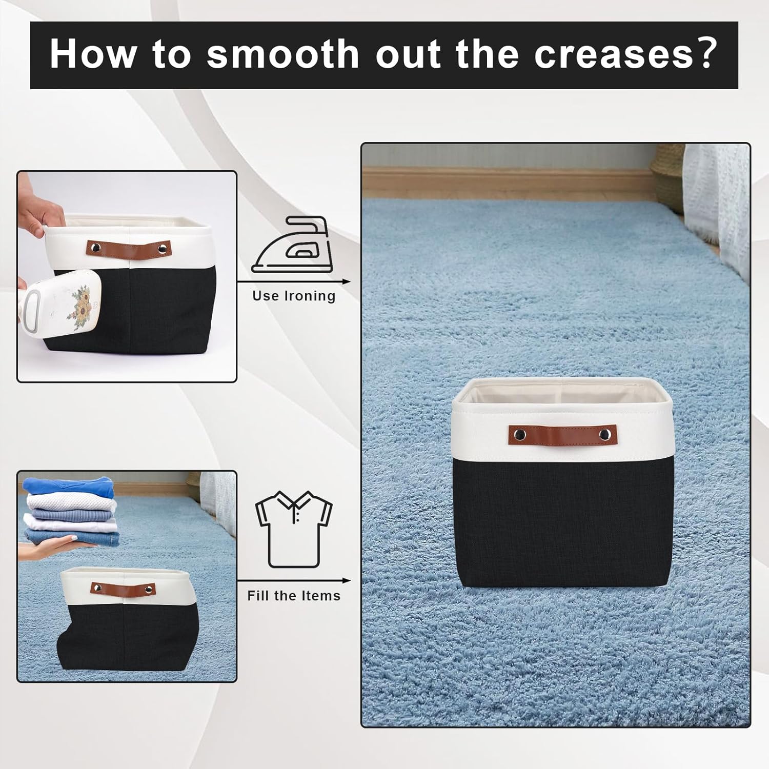 - 【Maintenance & Care Tip】 - Collapsible design for space saving. Our foldable baskets comes in a compression packing which may result in wrinkled storage bin during the long transit. Get rid of the wrinkles by either stuffing the fabric storage bins with blankets and pillows for a few days or steam iron them at low-heat setting. The organization baskets are easy to clean, you can dust the basket with a soft cloth with light soapy water when needed. Not recommended to machine wash.