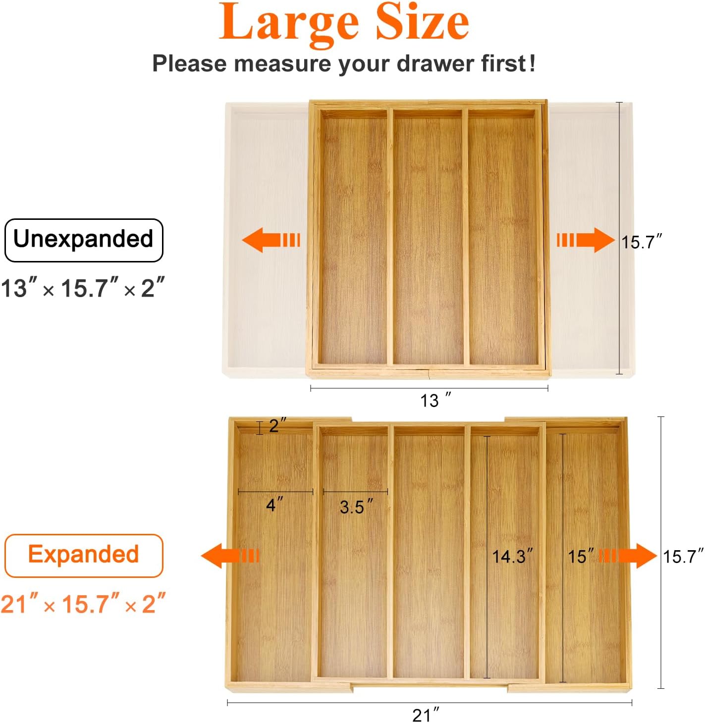 - Expandable and Adjustable: The kitchen drawer organizer can be expanded from 13" to 21" in width, which provide 3~ 5 slots that will be fully stored in a variety of ways to maximize your space. When folded, it measures 13" x 15.7" x 2", but expands to 21" x 15.7" x 2" for added space.