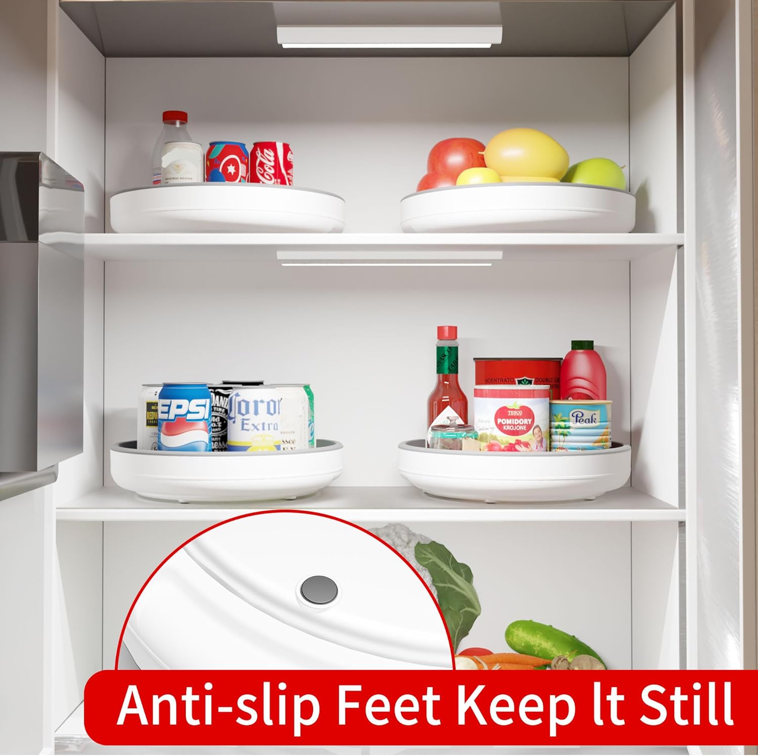 - Multifunctional Turntable Organizer - Perfect spinning lazy susan organizer for kitchen, pantry storage, dining room, bathroom countertop, table, under the sink, refrigerator, cabinet closet,etc. You can organize such as spice jars, oil bottles, drinks, toiletries, cosmetics, etc
