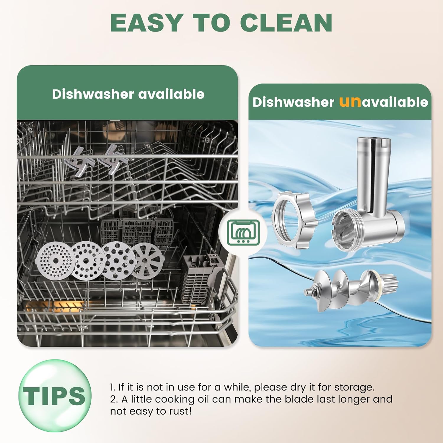 - [Effortless cleanup] All detachable parts of our electric meat grinder and sausage maker are easily removable, making cleaning a breeze. After washing, simply wipe the components dry and apply a small amount of edible oil to prevent rust and maintain optimal performance