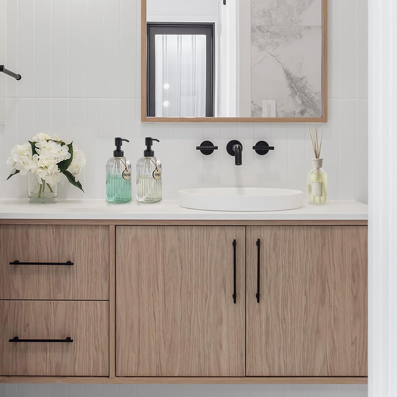 - ATTRACTIVE BATHROOM ACCESSORIES: 2Pack Elegant Bathroom Soap Dispensers With Black Rustproof Pump. Lovely Way to Bring Visual Texture to Your Bathroom and Kitchen.