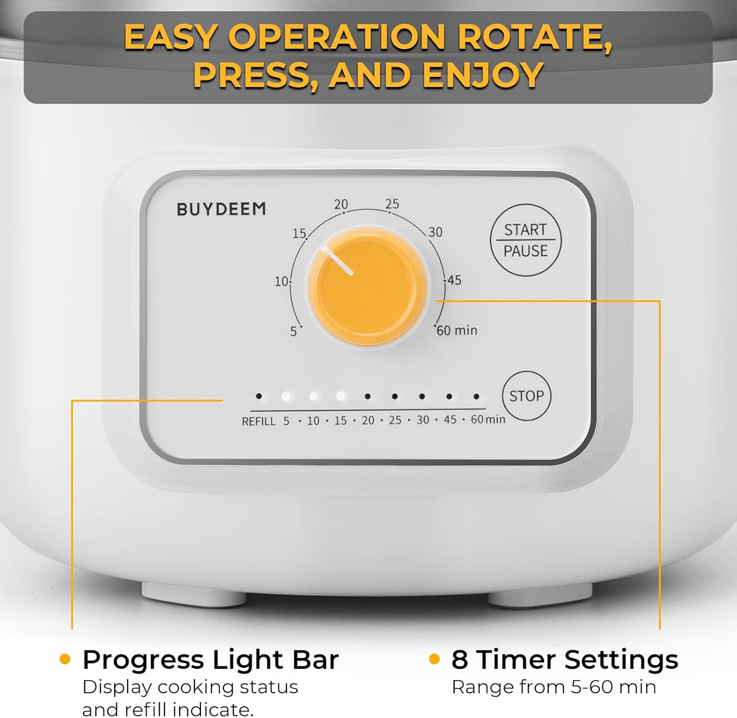 BUYDEEM G32 Electric Food Steamer 1.6QT, Stainless Steel Steamer for Vegetable Egg Seafood, 8 Time Settings, Triple Dry Protection, Quick Steam, Healthy Cooking for 1-2 Servings, Arctic White