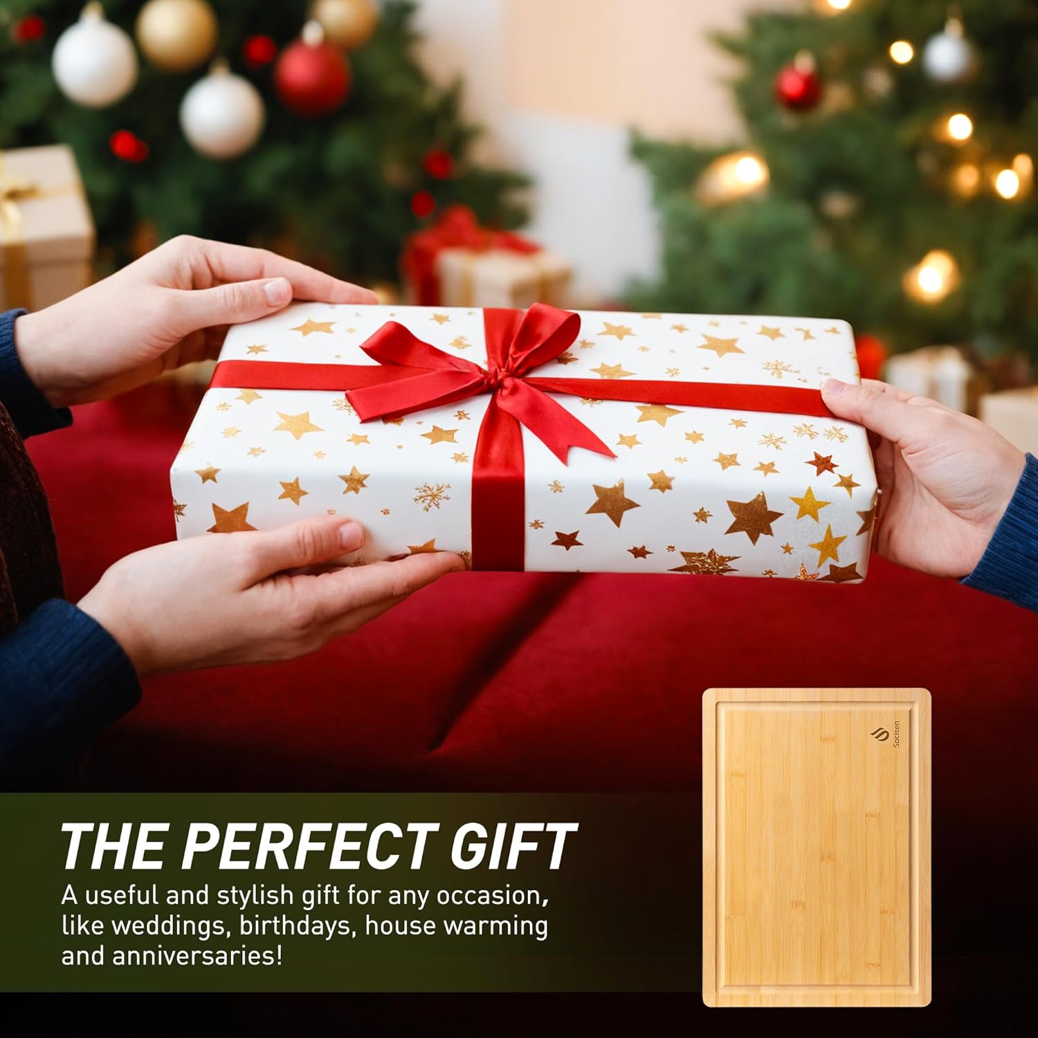 - Knife-Safe Surface for Edge Preservation: Our bamboo cutting board features a durable and thick surface. Meticulously polished to be ultra-smooth and flat, it has no burrs, cracks, or splinters. The cutting board is gentle on knives, reducing dulling and blade damage. Whether using a serrated knife for bread or a chef's knife for vegetables, the wood cutting board prevents blades from dulling quickly, saving you time on sharpening and allowing more time for enjoying your cooking.