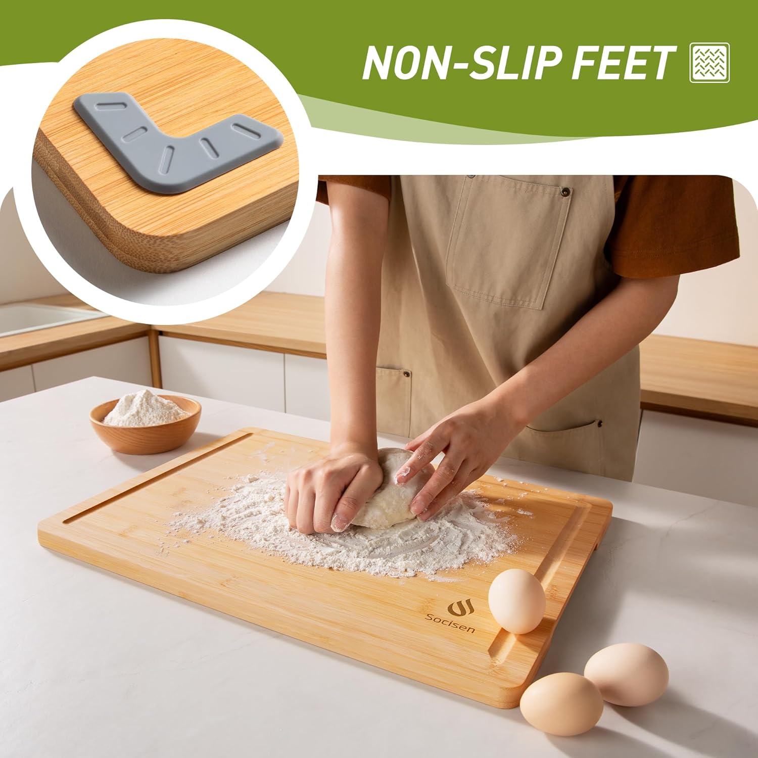 - Perfectly Sized for Versatile Use: Our bamboo cutting board has perfectly sized for Versatile Use. This extra-large bamboo cutting board, sized at 19.5 x 14 inches, is your kitchen's best ally for preparing large feasts. Its non-slip design ensures stability during carving and slicing of turkeys, prime rib, and more. The generous surface area keeps meal prep organized and clutter-free, making it a must-have for any cooking enthusiast. Perfect for various kitchen tasks and charcuterie boards.