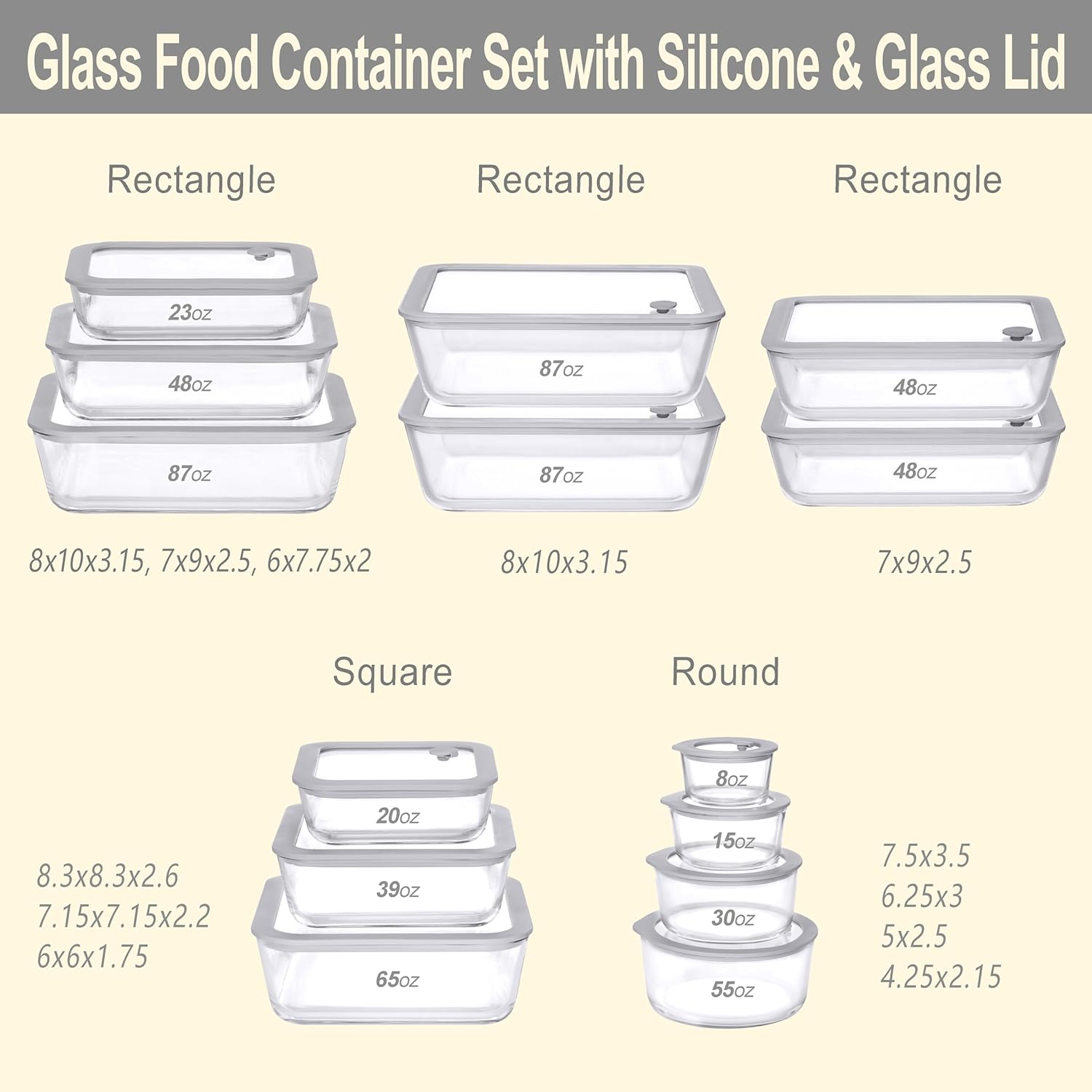 - ✅STYLISH & CLASSIC GREY COLOR: Our glass container set features clear glass lids with stylish light grey silicone frames for easy viewing leftovers in the spotlight. Each set comes in modern colors that will match with your classic collection. The glass storage containers with glass lids are healthier than plastic containers and metal containers.