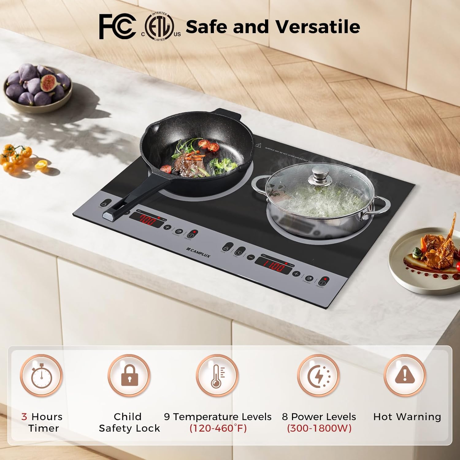 - Safe & Versatile: Has 3-hour auto timer, so you don’t need to monitor the cooktop. This countertop burner includes multiple safety protections: ETL certification, safety lock, hot surface indicator, overheat protection, and automatic shutoff