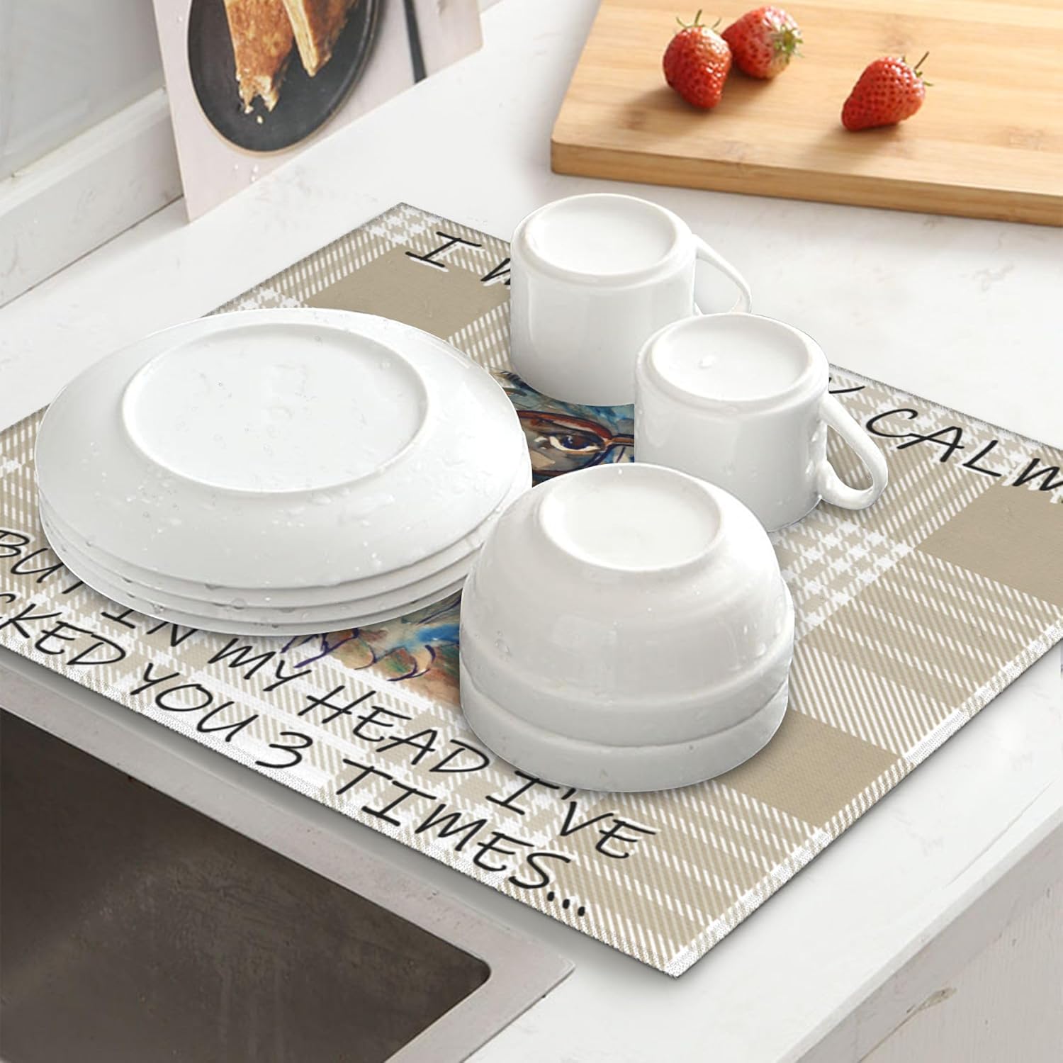 - Cute print can easily dress up your kitchen dining room. Drying pad suitable for draining racks to keep the counter dry and clean, or you can place pans, bowls, plates, pots, cups, bottles, tableware, ect