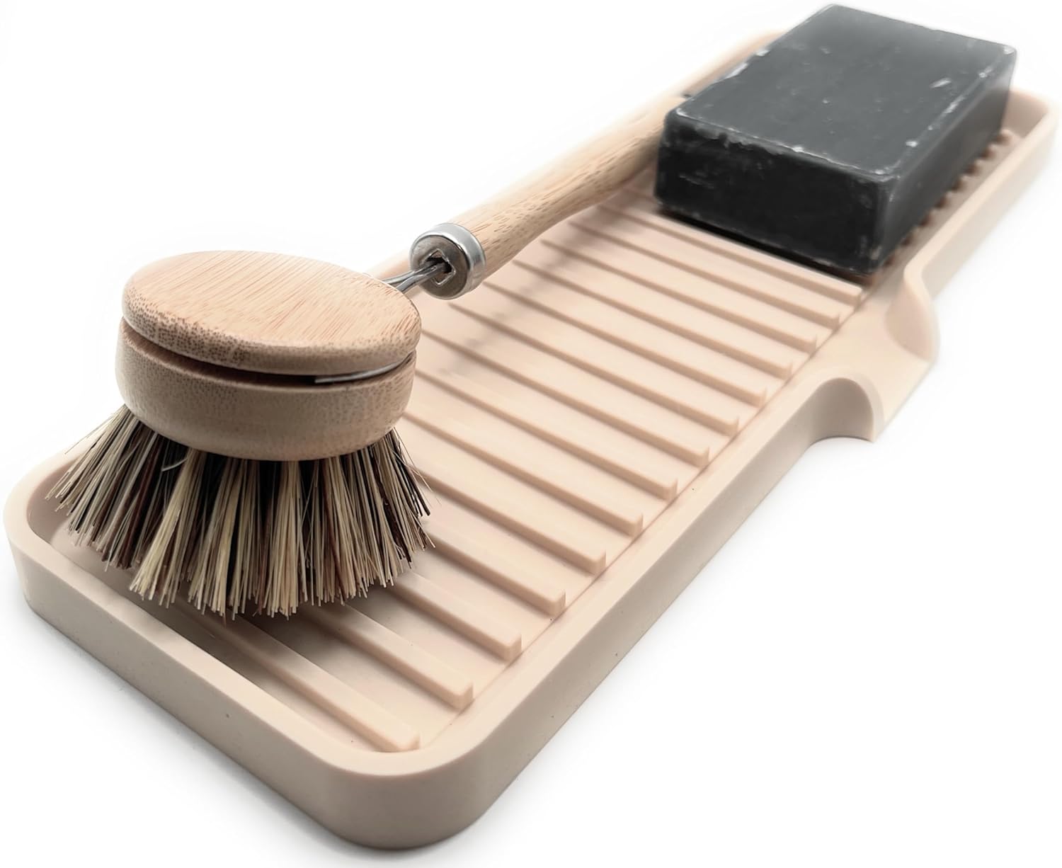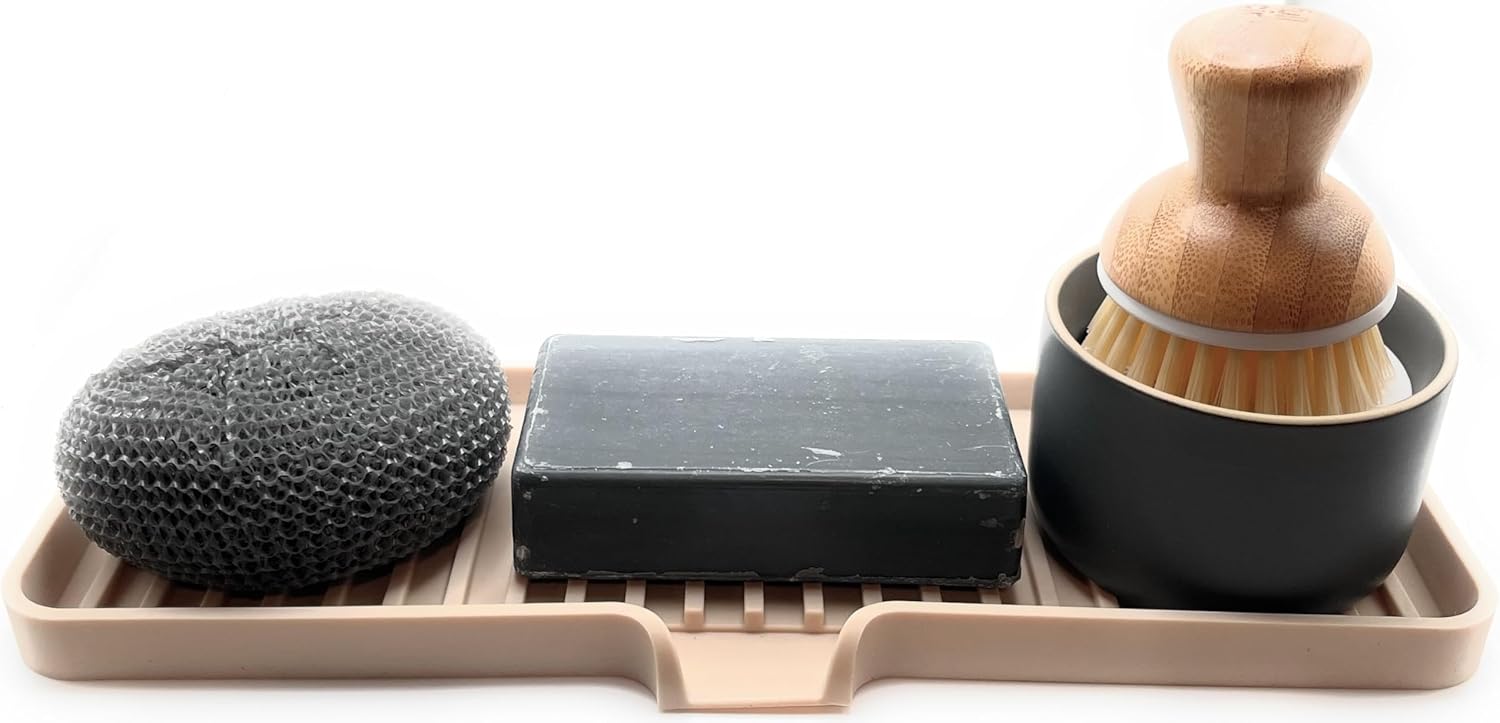 Happitasa Silicone Soap Dish Tray and Sponge Holder with Drain Chute | Bathroom and Kitchen Sink Organizer Caddy (Sand Dollar, 12"x4", 7.4 Ounces)