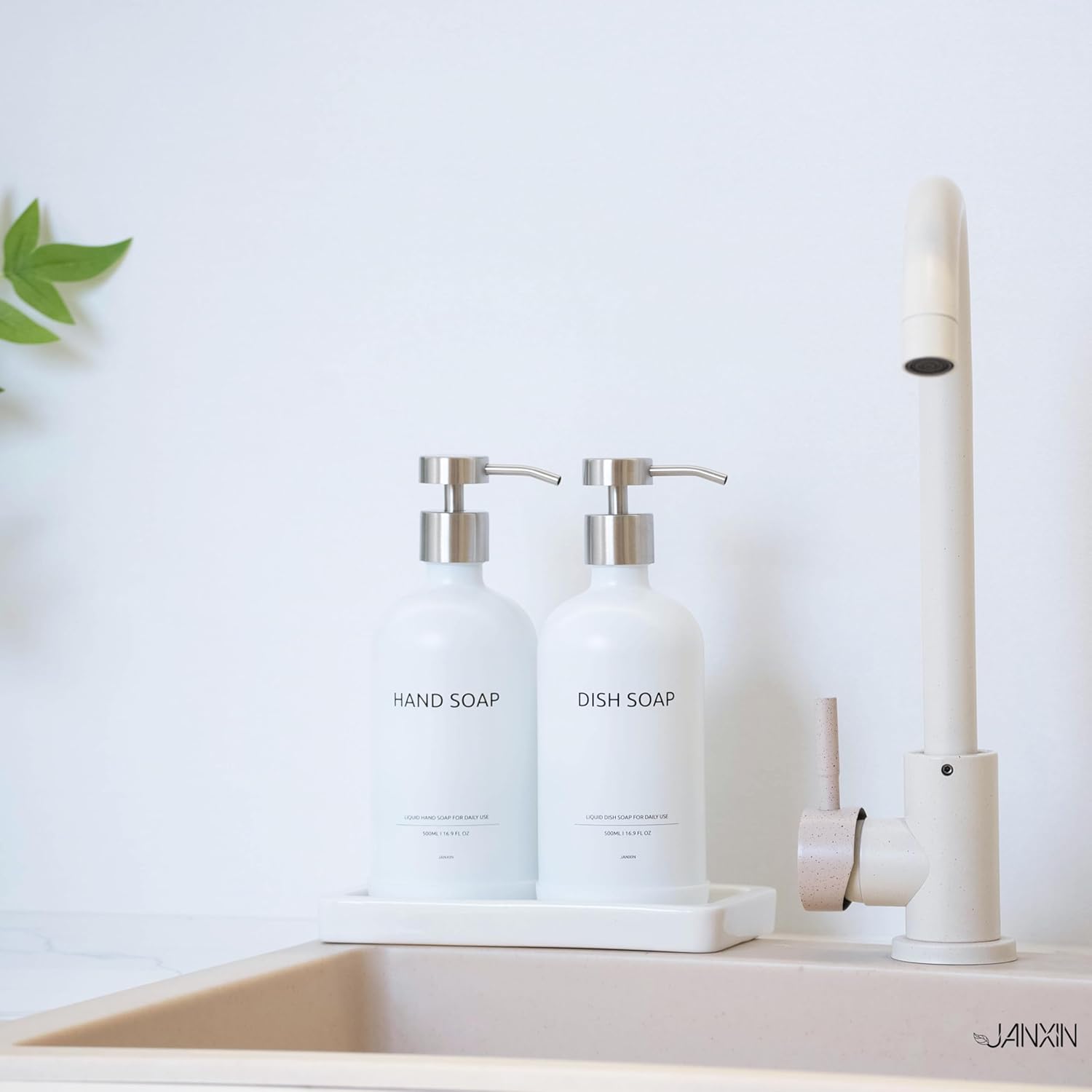 - LUXURY SOAP DISPENSER SET: Transform your kitchen or bathroom decor instantly with our luxurious kitchen soap dispenser set, This set includes two 16.9 OZ/500 premium glass bottles with 2CC stainless steel pumps, two silicone bottom anti-slip pads, one ceramic tray . Great for upgrading your kitchen and bathroom countertops with this stylish soap dispenser set