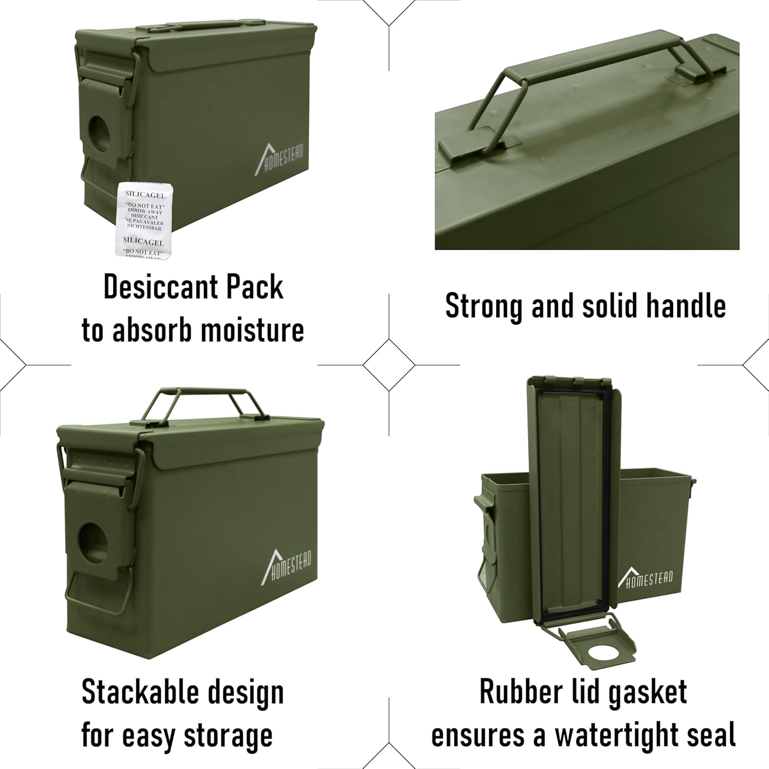 HOMESTEAD 30 Cal Metal Ammo Cans – 4 Pack M19A1 Military Steel Storage Boxes, Airtight & Water-Resistant Containers for Ammunition or Tools, Green Color
